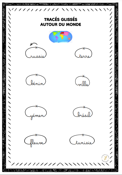 L'objectif est de fluidifier l'écriture avec la détente du geste, le sens du tracé des lettres et les groupements rationnels (mettre les barres de t, les points sur les i et les accents en dernier) tout en s'amusant avec les mots.