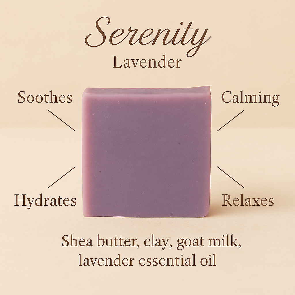 Soothe your skin and senses with Serenity, a handmade lavender soap crafted for moments of self-care and calm. Enriched with nourishing oils and pure lavender essential oil, this gentle bar cleanses without drying and leaves your skin soft, hydrated, and delicately scented.