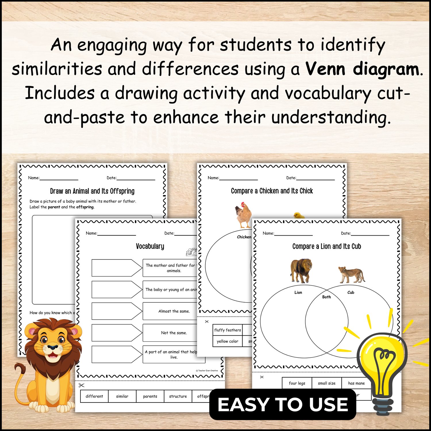 By working through these easy-to-use worksheets, your students will observe real-life animal pictures and identify the similarities and differences between animals and their young. They will then use Venn diagrams to sort these similarities and differences through an engaging cut-and-paste activity.