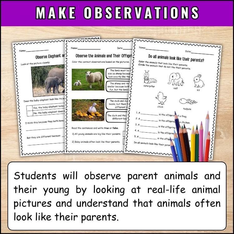 Use these no-prep worksheets to reinforce your students’ understanding that young animals are often similar to their parents, but they also have differences.