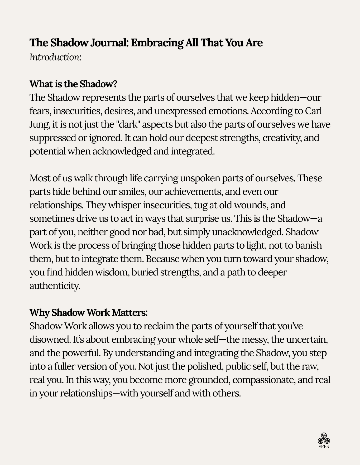 Rooted in the Jungian concept of the shadow, this journal explores the aspects of ourselves we unconsciously reject, hide, or disown. Each section invites curiosity, reflection, and a more compassionate way of relating to yourself, especially in the moments that feel hardest to understand.