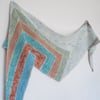 A simple garter stitch shawl which knits up to give a long, thin wrappable shape. A set of paired, central decreases give a mitered-style centre to make the most of contrasting stripes. It is deceptively small whilst knitting, but as a kite soars majestically after launch, this shawl (whilst not exactly reaching those giddy heights) will certainly expand magically after a good blocking.