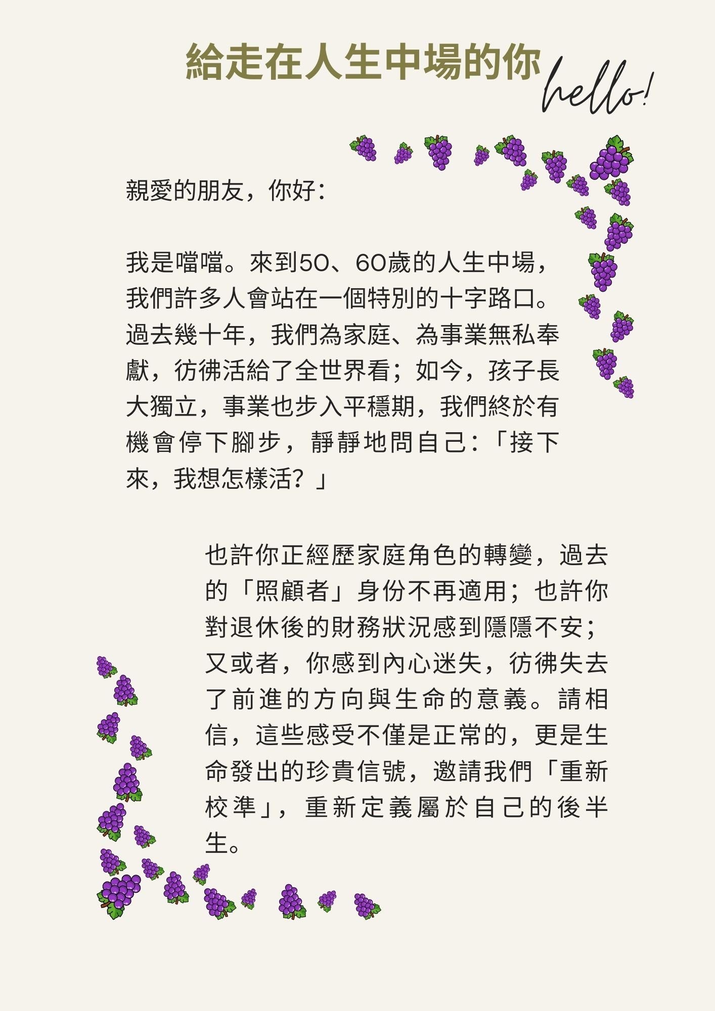 - 也許你正經歷家庭角色的轉變,過去的「照顧者」身份不再適用;也許你對退休後的財務狀況感到隱隱不安;又或者,你感到內心迷失,彷彿失去了前進的方向與生命的意義。請相信,這些感受不僅是正常的,更是生命發出的珍貴信號,邀請我們「重新校準」,重新定義屬於自己的後半生。
