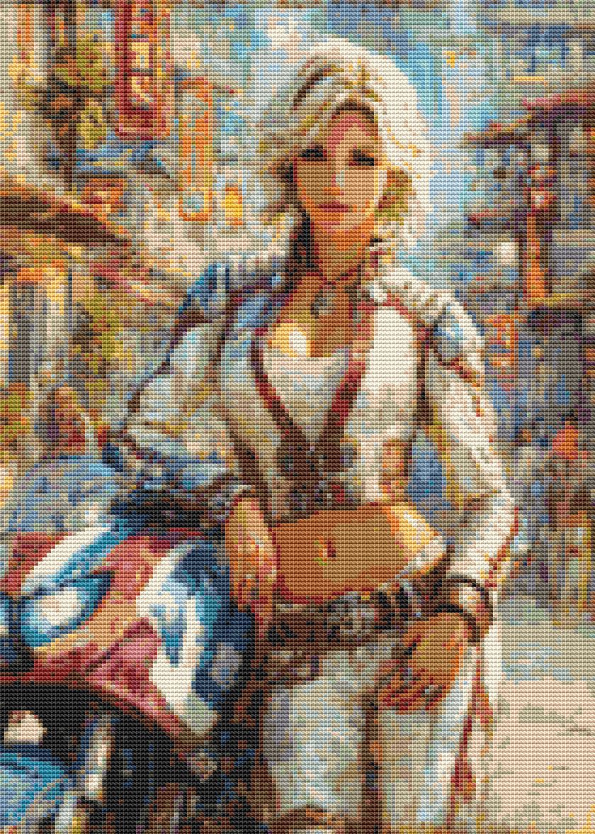 Capture the bold confidence of modern city life with this striking “City Rider” cross stitch pattern. Featuring a stylish woman posed beside her motorcycle against a vibrant urban backdrop, this design blends grit and elegance with a painterly, contemporary feel. Rich colors, textured details, and full stitches only make this an engaging project for stitchers who love strong female figures and modern art-inspired scenes.