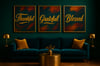 Each piece showcases gorgeous hand-lettered script in rich golden tones against a sophisticated teal and amber brushstroke background. The warm color palette combines deep teals, burnt orange, and golden amber accents to create an inviting, luxurious aesthetic that complements both modern and traditional interiors.