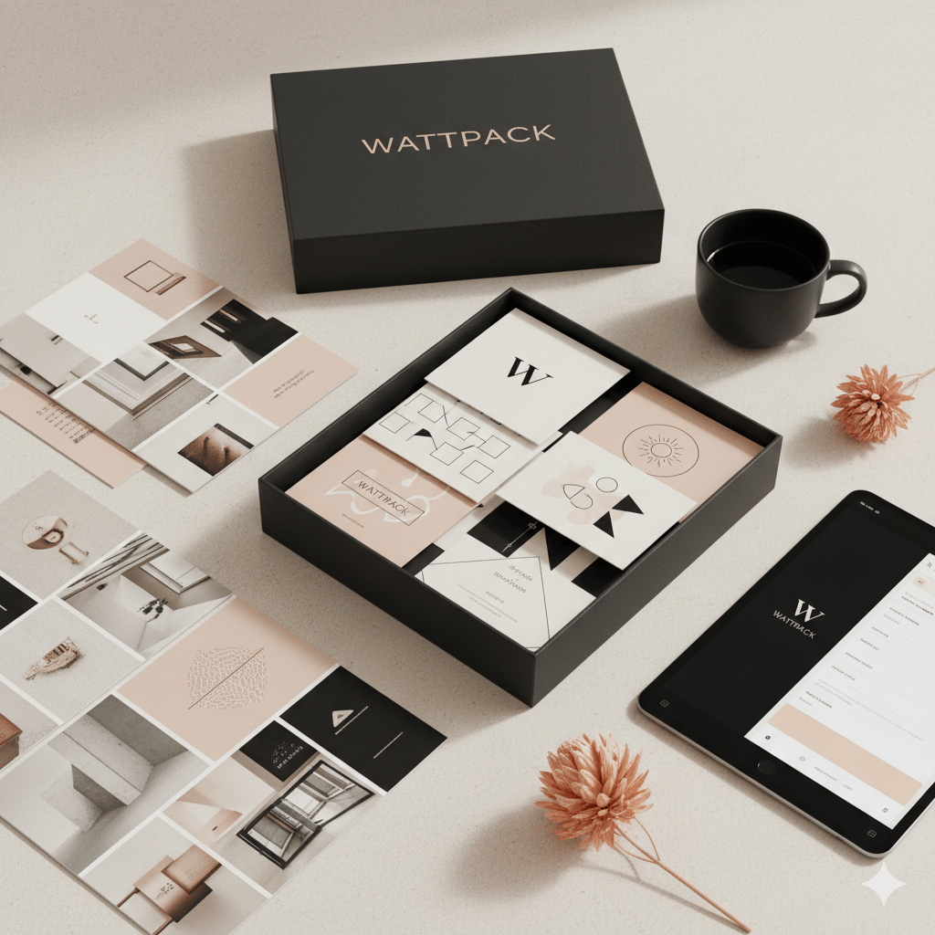 Discover the essence of modern, minimalist branding for the ambitious small business. This Wattpack is a curated collection of aesthetic graphics, templates, and inspiration boards—all draped in a sophisticated palette of soft neutral peach and deep black.