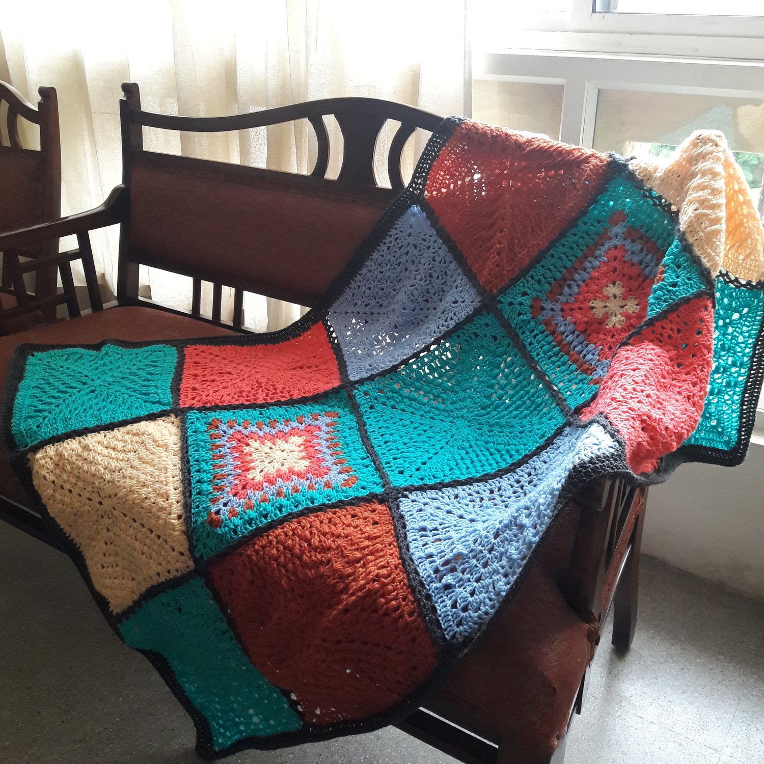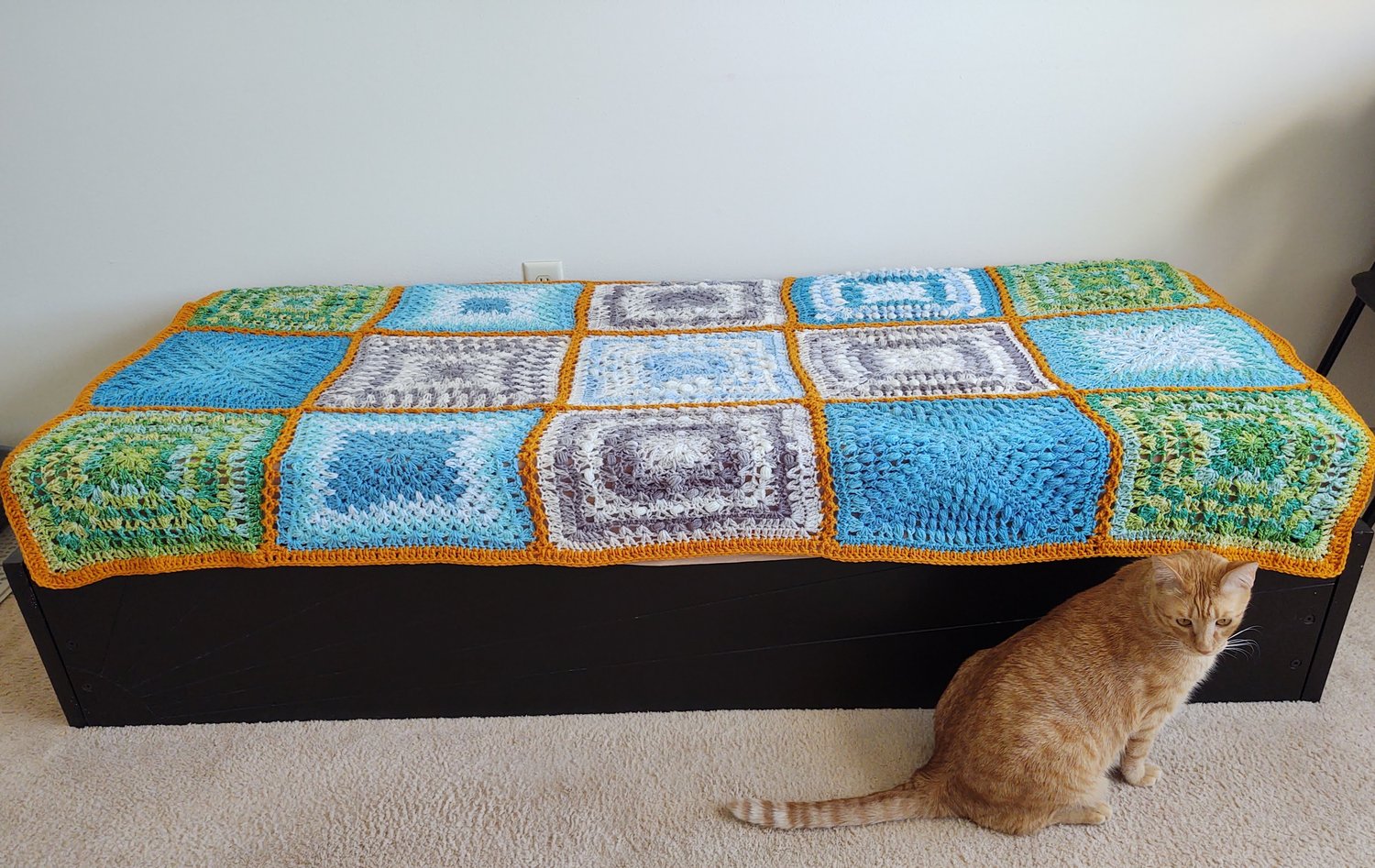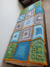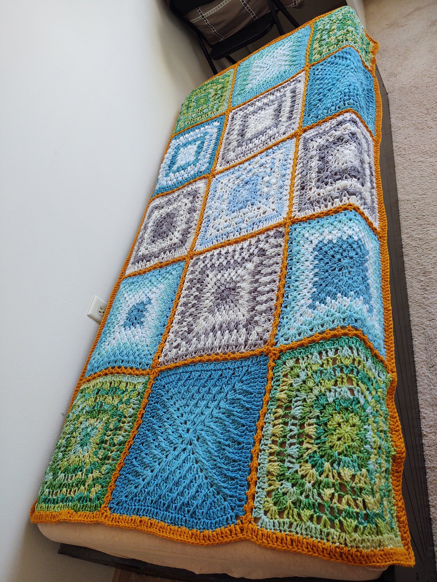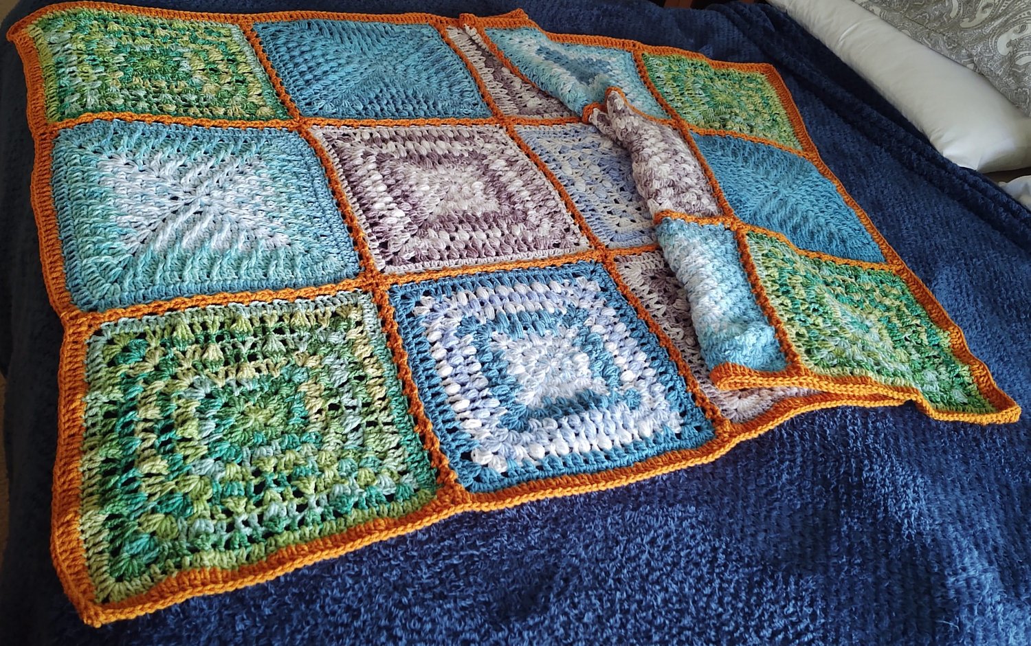 When the Kaatru (Wind) brings the Megam (Clouds) together we have a start of the Thooral (Drizzle) that can change quickly to Saaral (Slanted rain) and when the Mazhai (Downpour) subsides we are left with the beautiful Thulir!! This was the idea that helped build up this blanket /throw. One can make as many squares as one needs and as many of their favorite individual square to make up this beauty. The sample prototype has 3 squares each of Kaatru, Thooral and Megam, 2 squares of Saaral and 4 squares of Thulir, for a total of 15 squares. The prototype measures 40” wide by 70” long after adding a border around each square and one round of border around the entire blanket. The orange color was chosen based on a suggestion by a dear friend, to make the colors of the squares pop, to evoke the idea of sunshine after the rains. The joining instruction has a chart which will help you to join as you go without cutting yarn. You will have just two ends to weave in after the border is added. The place to watch out for is the junction of four corners of the squares being joined. You could also join them individually if you do not mind the weaving in process.