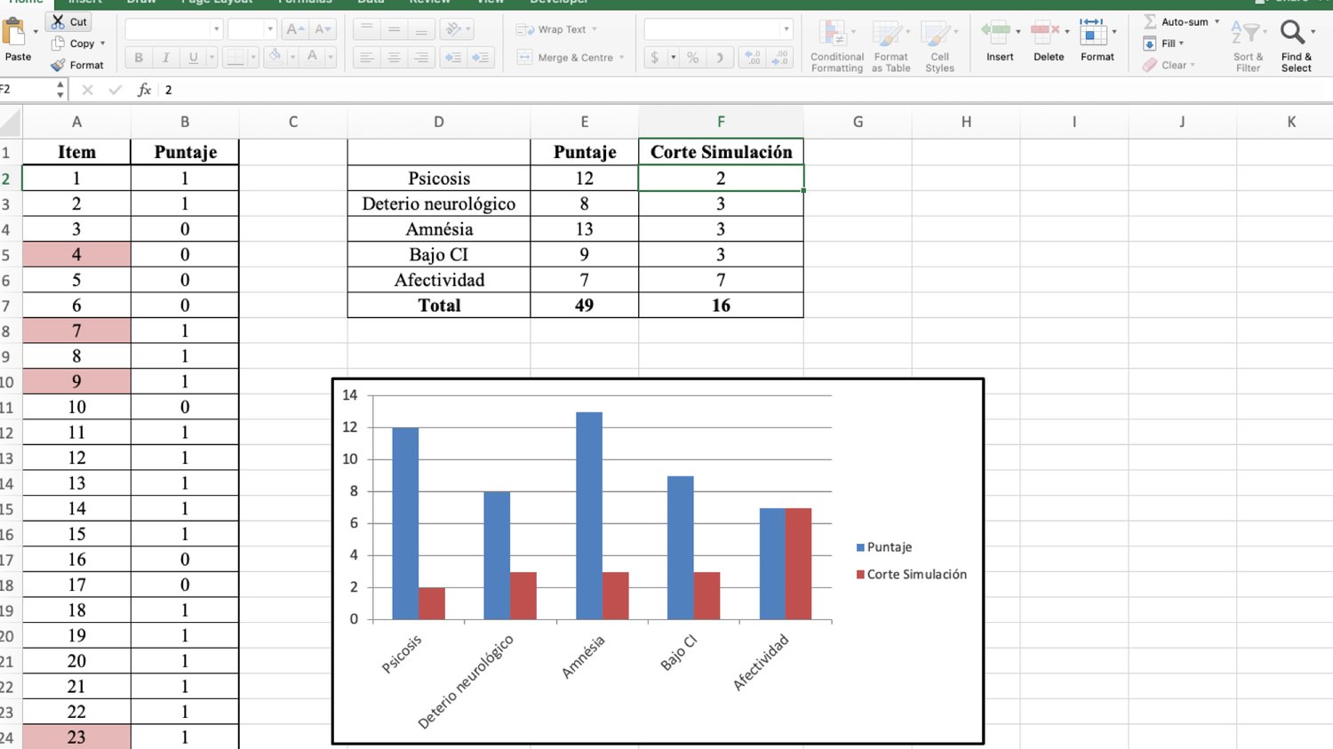 The SIMS Total Score allows you to establish the suspicion of simulation. Subsequently, the analysis of the elevations in the scores of the scales that compose it (Psychosis, Neurological deterioration, Amnestic Disorders, Low Intelligence and Affective Disorders) allows us to observe which symptomatology presents in an atypical way, or, how the individual tries to simulate a particular disorder. For each of the five scales, as well as for the total score, cutoff points are provided to consider suspicion of simulation.