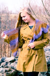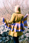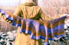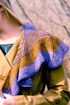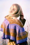 An elongated, asymmetrical, swirling shawl that uses two colors, and simple knit, increase and decrease stitches to achieve a striking shape. Cast on with 3 stitches at one corner, Swirligig grows asymmetrically on the bias; adding stitches to each triangular section, while at the same time shifting the triangles by increasing and decreasing on a bias tilt. The garter stitch wedges are set off by swirling lines of yarnovers, and a matching line of yarnovers finishes the long edge.