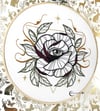 This enigmatic embroidery pattern features a lovely mystical rose and an all-seeing eye set in the center, a unique and eye-catching project. This downloadable PDF pattern is sized perfectly for an 8-inch hoop, it's ideal for both beginners and experienced embroiderers. A touch of metallic thread adds a subtle shimmer to a geometric triangle, creating a perfect balance.
