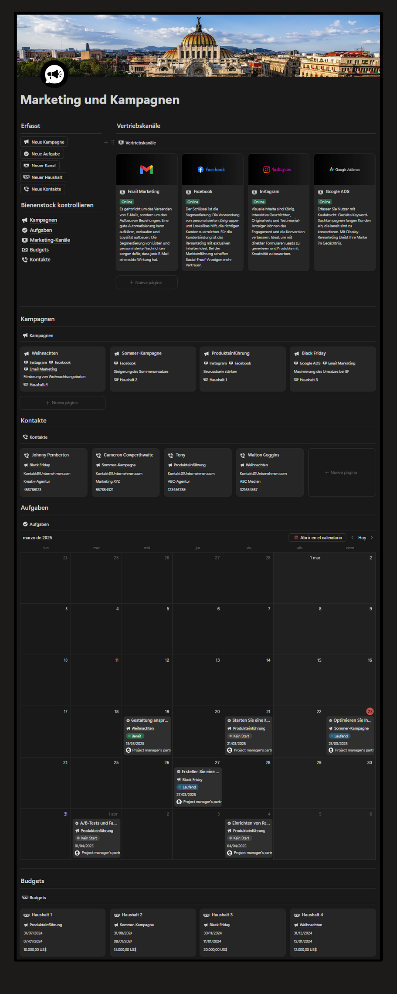 Bringe deine Marketingstrategie auf das nächste Level mit unserer Marketing und Kampagnen-Vorlage für Notion. Entwickelt für Marketingprofis und Teams, ermöglicht dir dieses Tool, jede deiner Kampagnen strukturiert und effizient zu planen, zu organisieren und zu optimieren. Von der Aufgabenverwaltung bis zur Budgetüberwachung – du hast alles, was du brauchst, um erfolgreiche Kampagnen durchzuführen und die Wirkung deiner Maßnahmen zu maximieren.