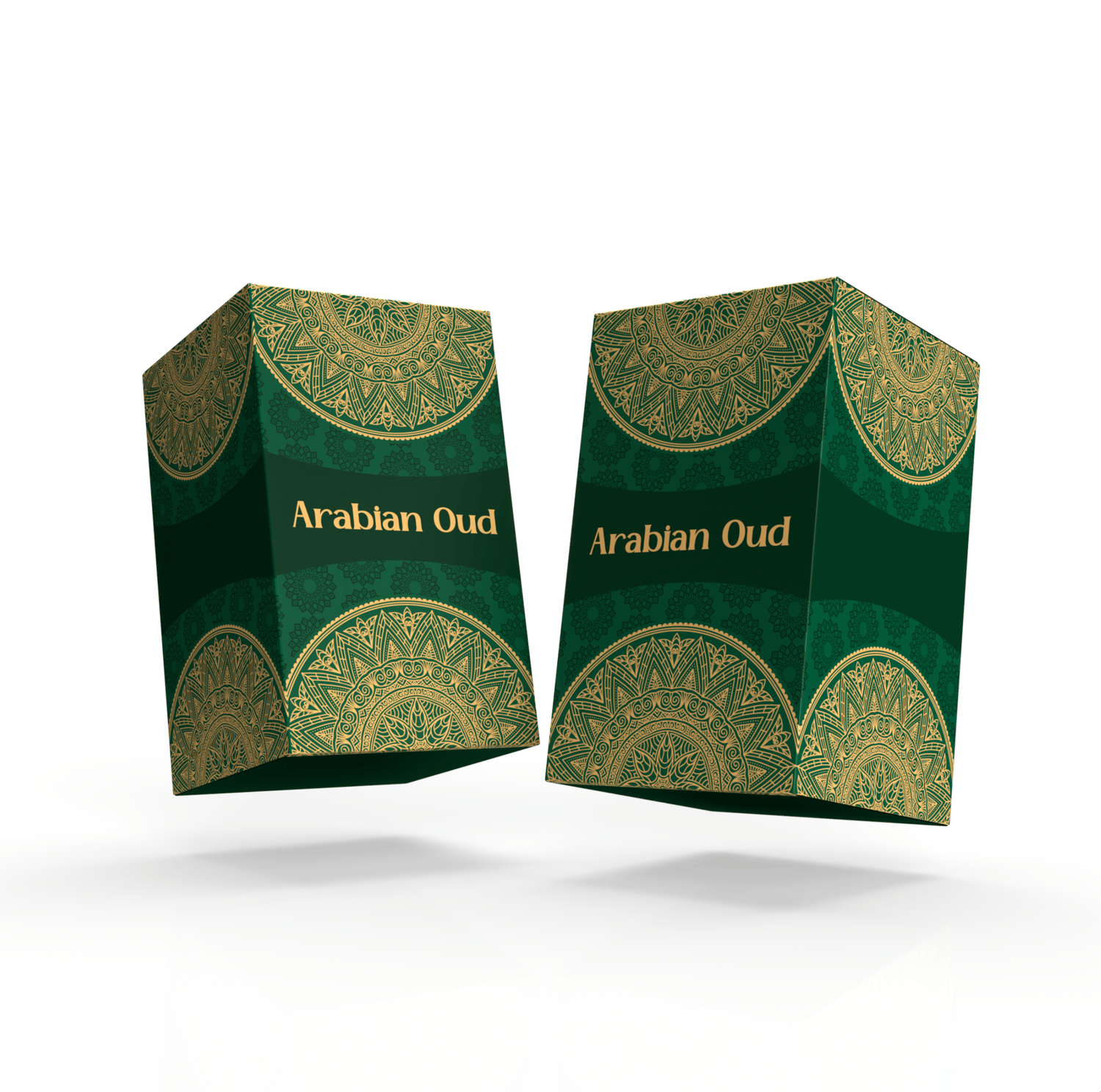 The shimmering gold accents are meticulously detailed, symbolizing the richness of oud and the elegance it represents. The bold, gold “Arabian Oud” typography stands out gracefully, making the brand instantly recognizable and memorable.