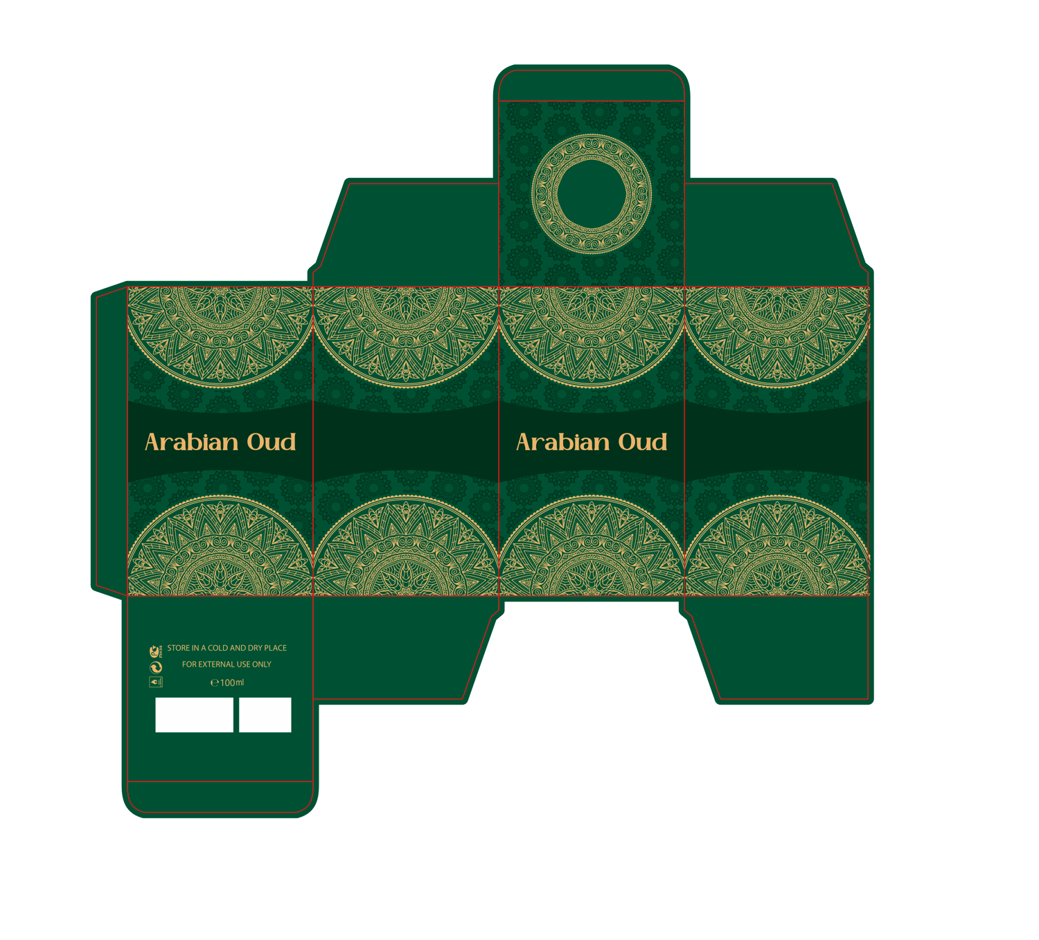 Elevate your fragrance brand with this luxurious Arabian Oud perfume box design, inspired by the rich traditions and timeless allure of the Middle East. Featuring an opulent dark green base adorned with intricate golden mandala patterns, this packaging instantly communicates sophistication, heritage, and premium quality.