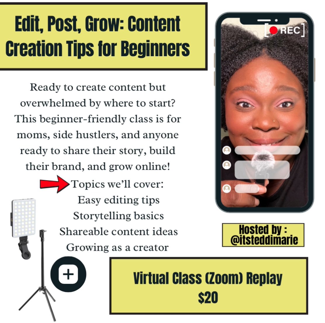 Are you ready to finally start creating content but feel overwhelmed by where to begin? This beginner-friendly class is for moms, side hustlers, and anyone ready to share their story, build their brand, and grow online!
