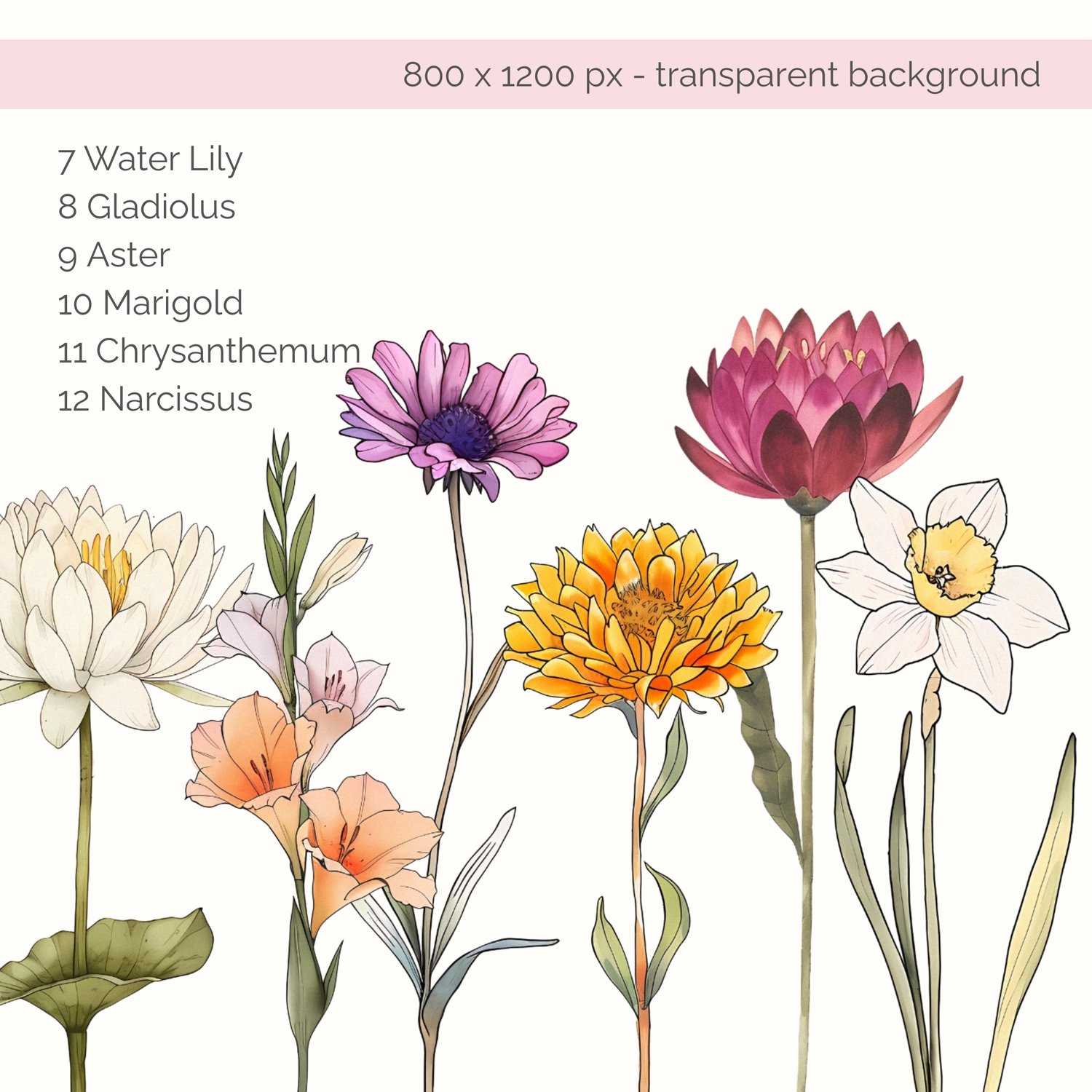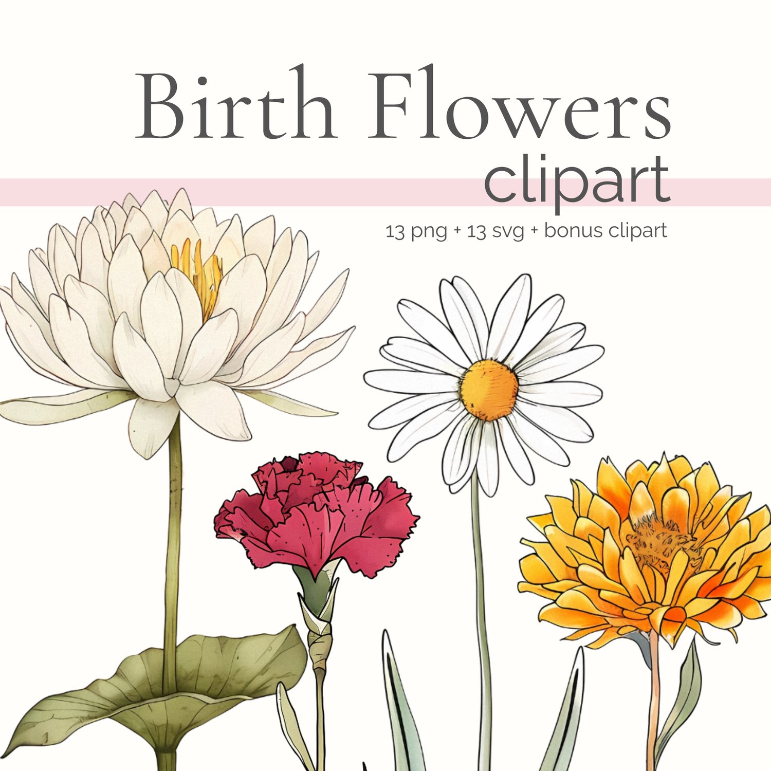 Explore the beauty of each birth month with this Birth Month Flower Clipart Bundle. This botanical collection features PNG and SVG images of birth flowers. Elevate your designs with this versatile set, perfect for creating stunning floral arrangements, bouquets, and botanical month-themed projects.