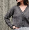 The Engravings cardigan is worked top down, with the body worked flat and the sleeves worked in the round. First stitches are cast on for the back, and the pattern for the back is established with three cable panels separated by sections of stockinette. The armholes are shaped as you work the back. Stitches for the front are picked up along each shoulder in turn and the front is worked top down until armscye depth is reached. Each front piece features one cable panel with stockinette worked on either side and, as for the back, armhole shaping is worked, along with shaping for the V-neck front. Once armscye depth is reached, front and back are joined and the remainder of the body is worked flat. Stitches are picked up around the armhole to form the sleeves, which are worked in the round. A cable panel is worked down the top centre of each sleeve and tapered shaping is worked until the cuff is reached. Stitches for a neckband are picked up around the V-neck front and around the back of neck. Buttons and buttonholes can be added or omitted along the neckband as preferred.