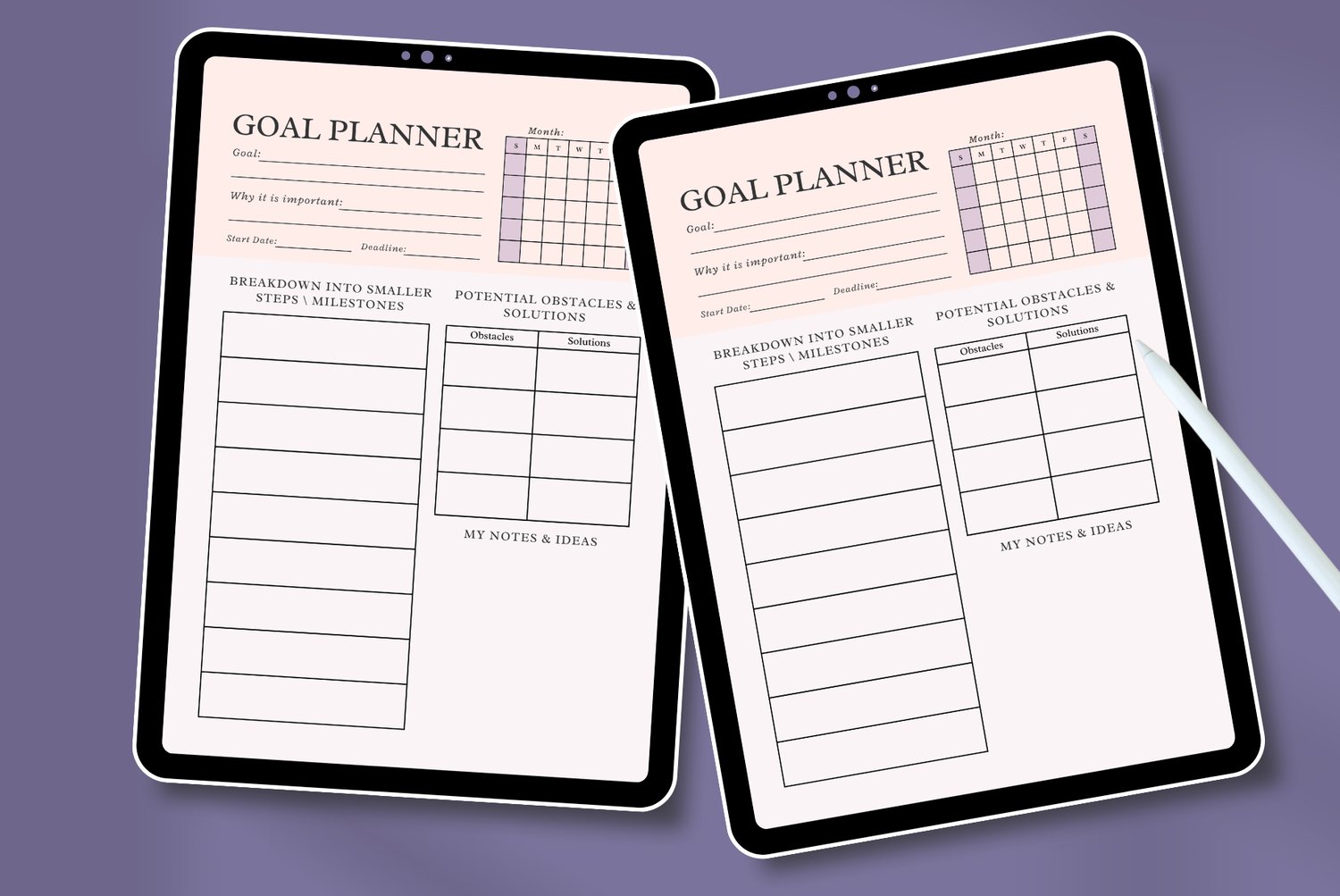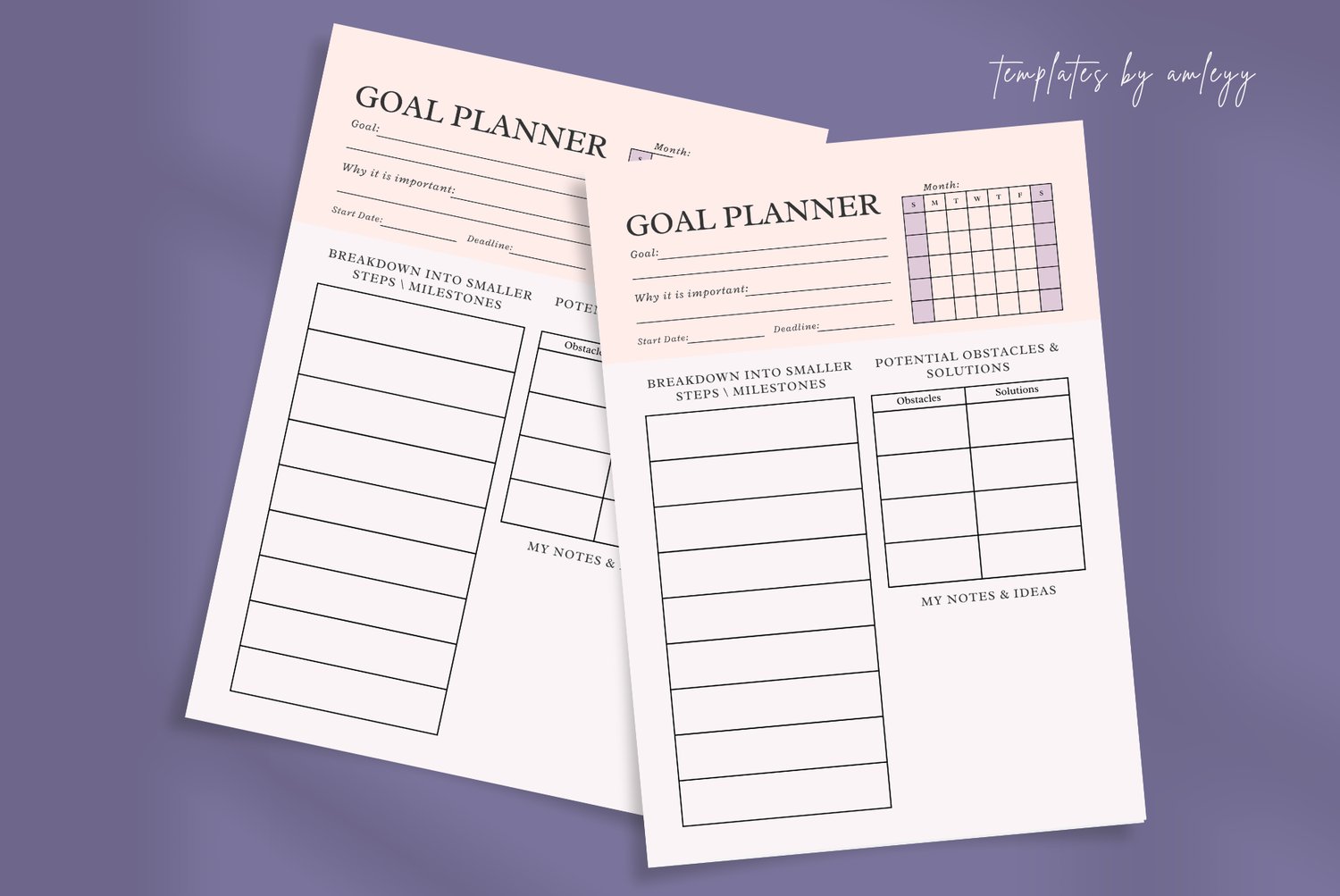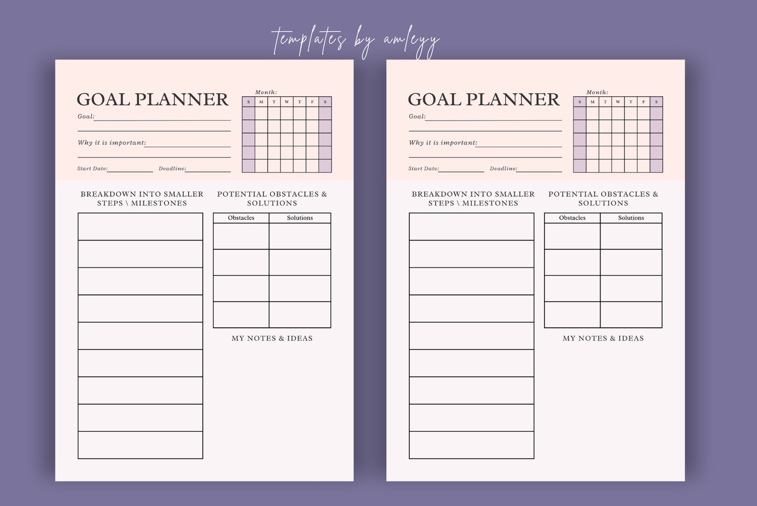 ✔ Goal section with space to write your main goal, importance, start date & deadline