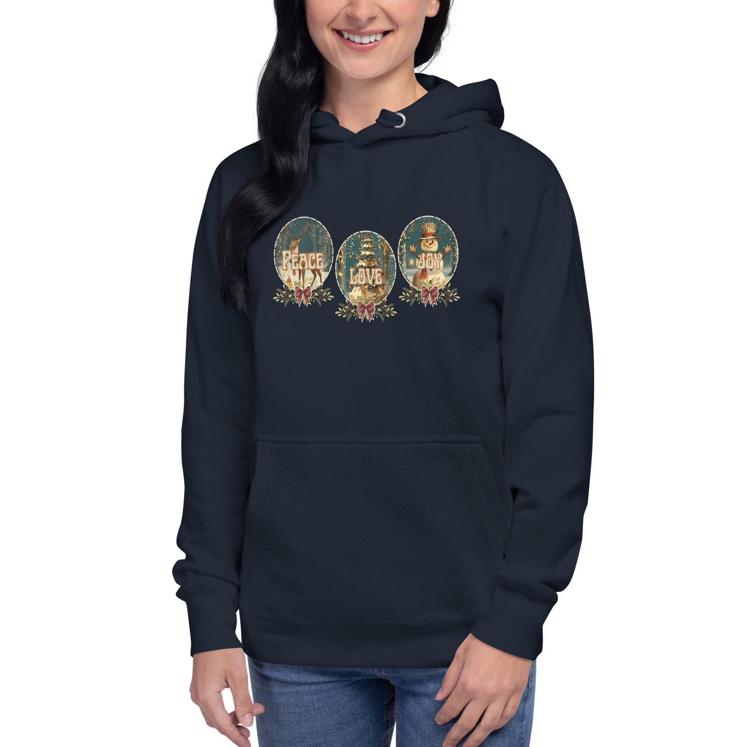 Luce el espíritu navideño con estilo con esta sudadera clásica unisex de diseño exclusivo en acuarela vintage. Con estampado de reno, árbol de Navidad y muñeco de nieve acompañados de las palabras Peace, Love, Joy, transmite alegría, paz y amor en cada detalle.