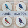 Bundle of four cross stitch bird patterns - save over 30%. This bundle features four colourful American buntings: indigo, lazuli, painted and varied. Each bird is also available individually.