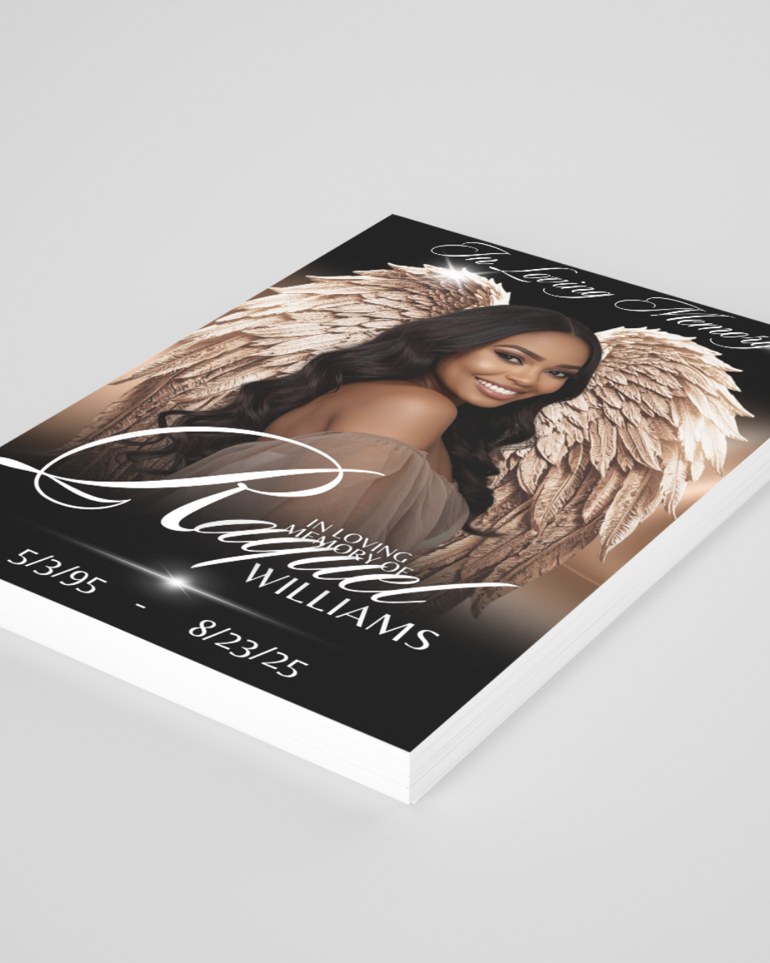 Honor your loved one with this editable memorial design template featuring an elegant gold theme. Perfect for funerals, memorials, or celebration of life services, this design adds a warm and dignified touch to your program.