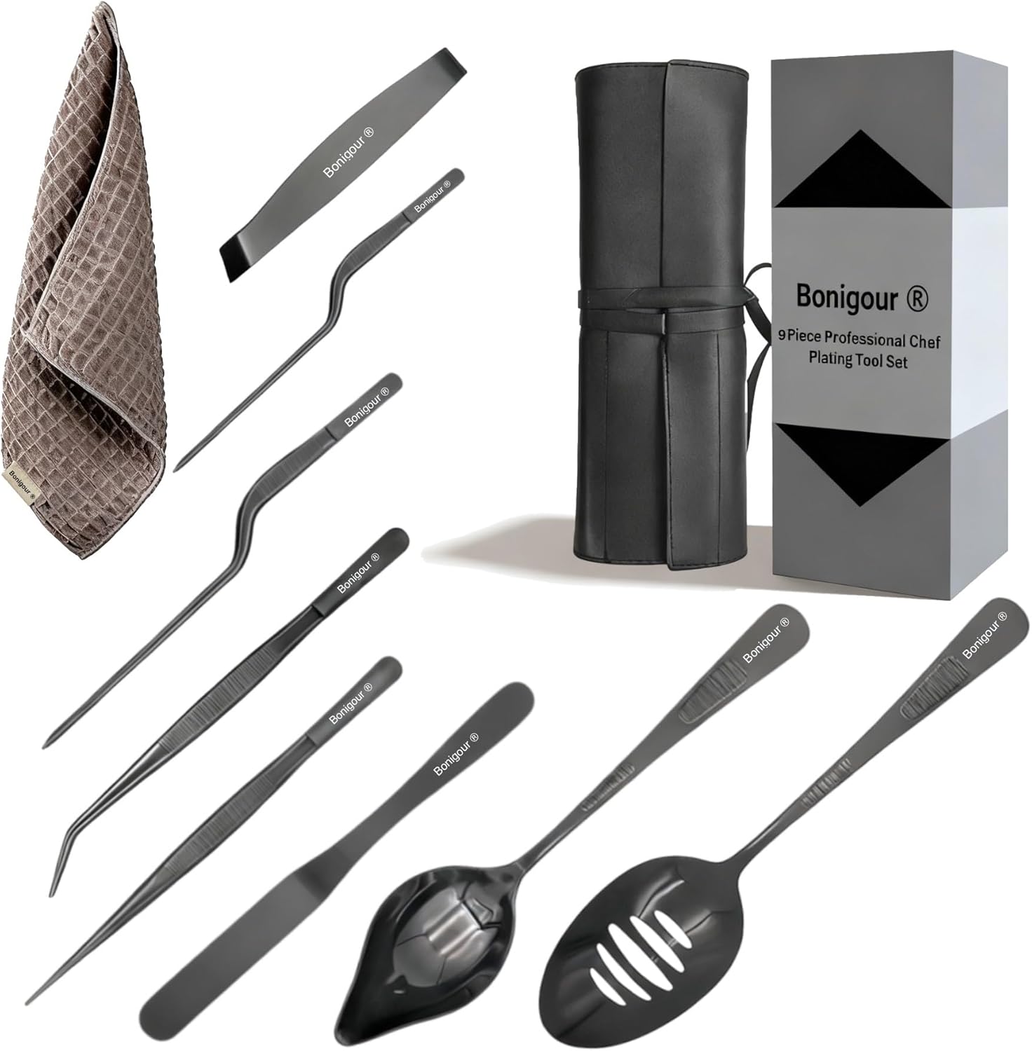 Comprehensive 8-Piece Set: Includes 4 fish bone tweezers (7/10"), 6.5" precision offset tweezers, 8" flexible offset spatula, 8" precision offset tweezers, 8" curved tip tweezers, 8" straight tip tweezers, 9" petite saucier spoon, 9" slotted bowl, plus a high-quality kitchen towel (random color), PU storage bag, and maintenance guide.