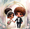 Chibi bride and groom bundle. 2 Free backgrounds; square and A4 size. 2 readymade couples to customise with hair and eye colour clipart, individual bride and groom options to mix and match. Darker skin colours included. 58 PNGs.