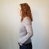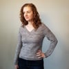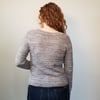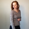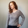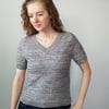 Timeless Twist is worked from the top down. It is worked flat until the V-Neck is joined at the centre front, and then in the round to the underarm separation. Sleeve stitches are put on hold while the body is worked down to the hem. The sleeves are then worked top down with the option of short or long sleeves. The collar is picked up from the edge of the neckline and worked in the round.