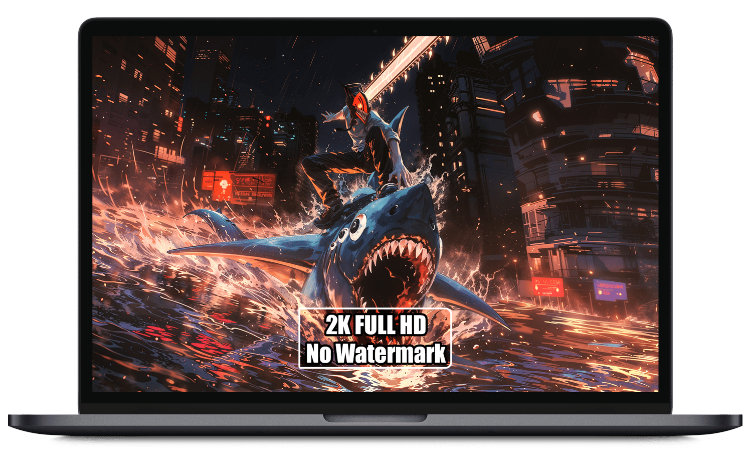 - Dynamic composition capturing Denji's chainsaw combat and Beam's shark-like energy as they plow through a neon-lit flood.