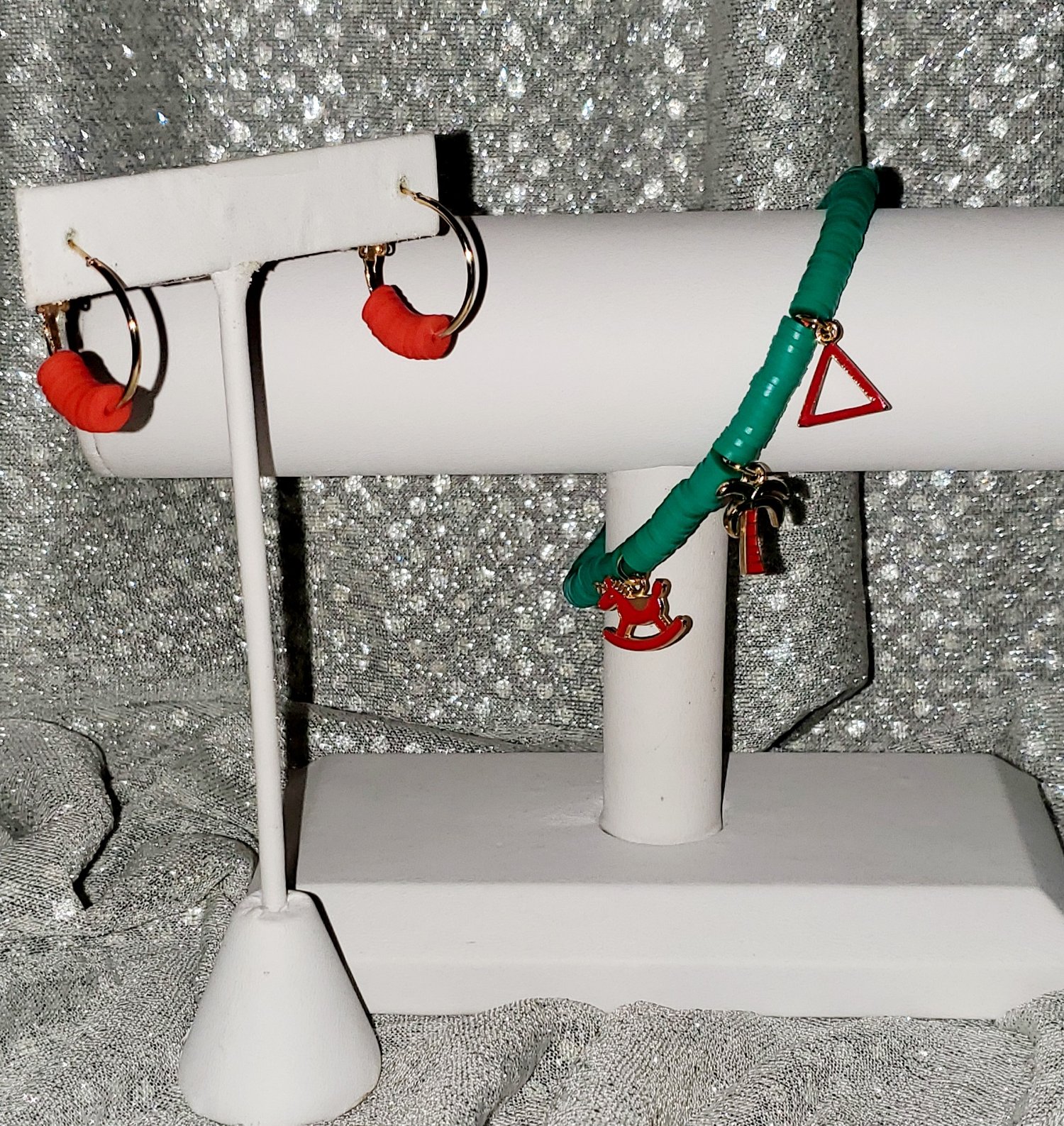 📦Green-Red Clay Bead Bracelet/Earrings Set #GBES7