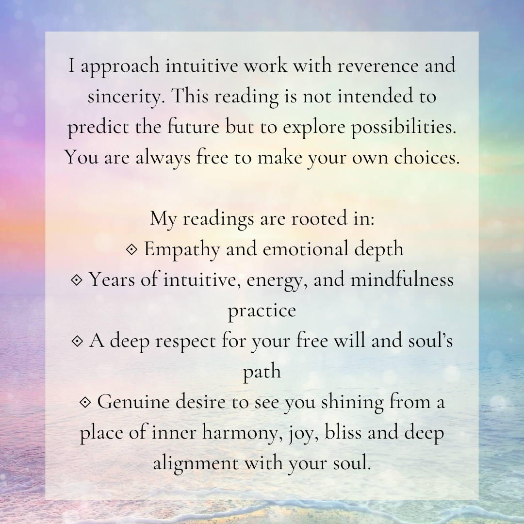 Each reading is done in sacred space with intention to be of Highest good to you and serve you in Divine light, purity and love.