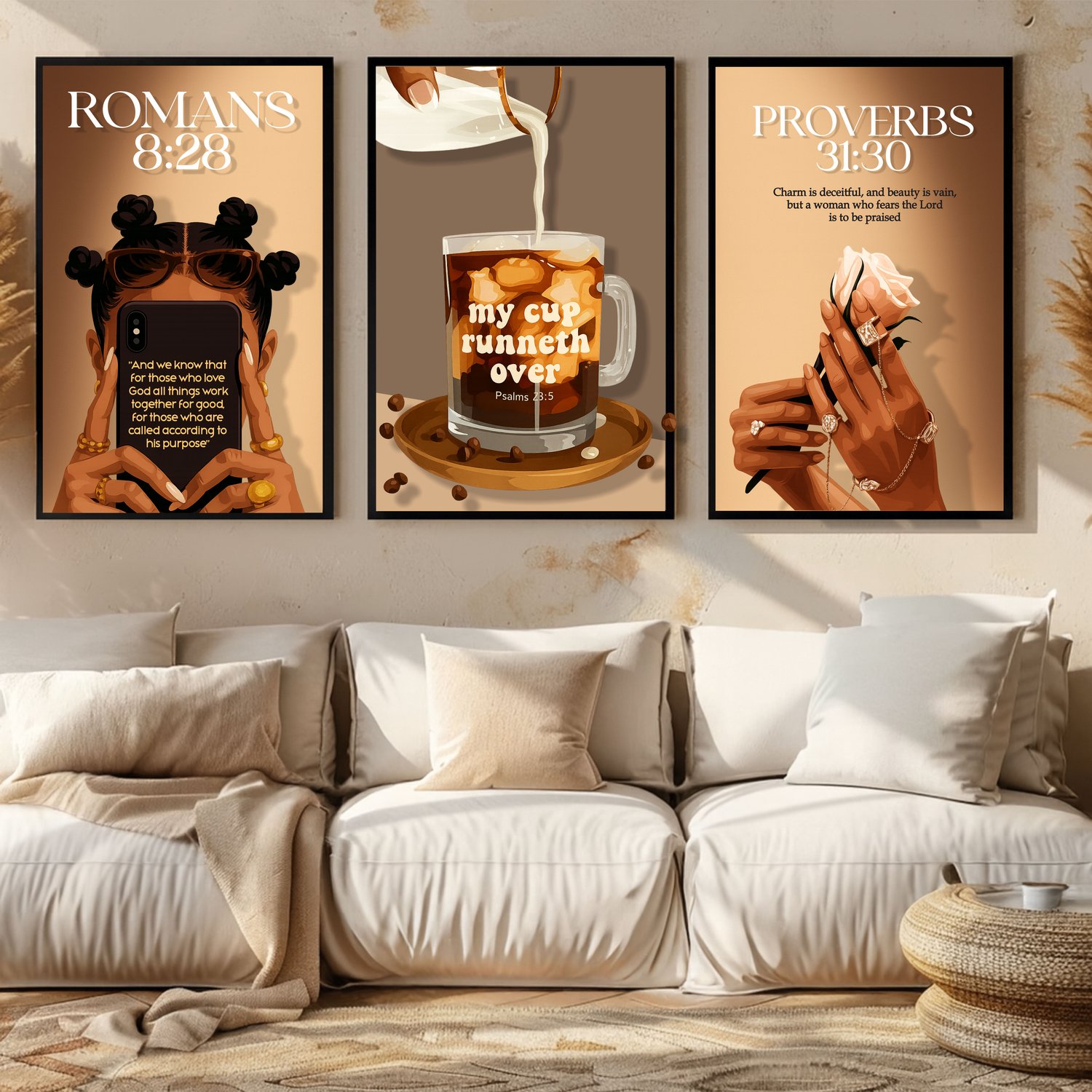 Christian Wall Art Collection – Psalms 23:5, Proverbs 31:30 & Romans 8:28