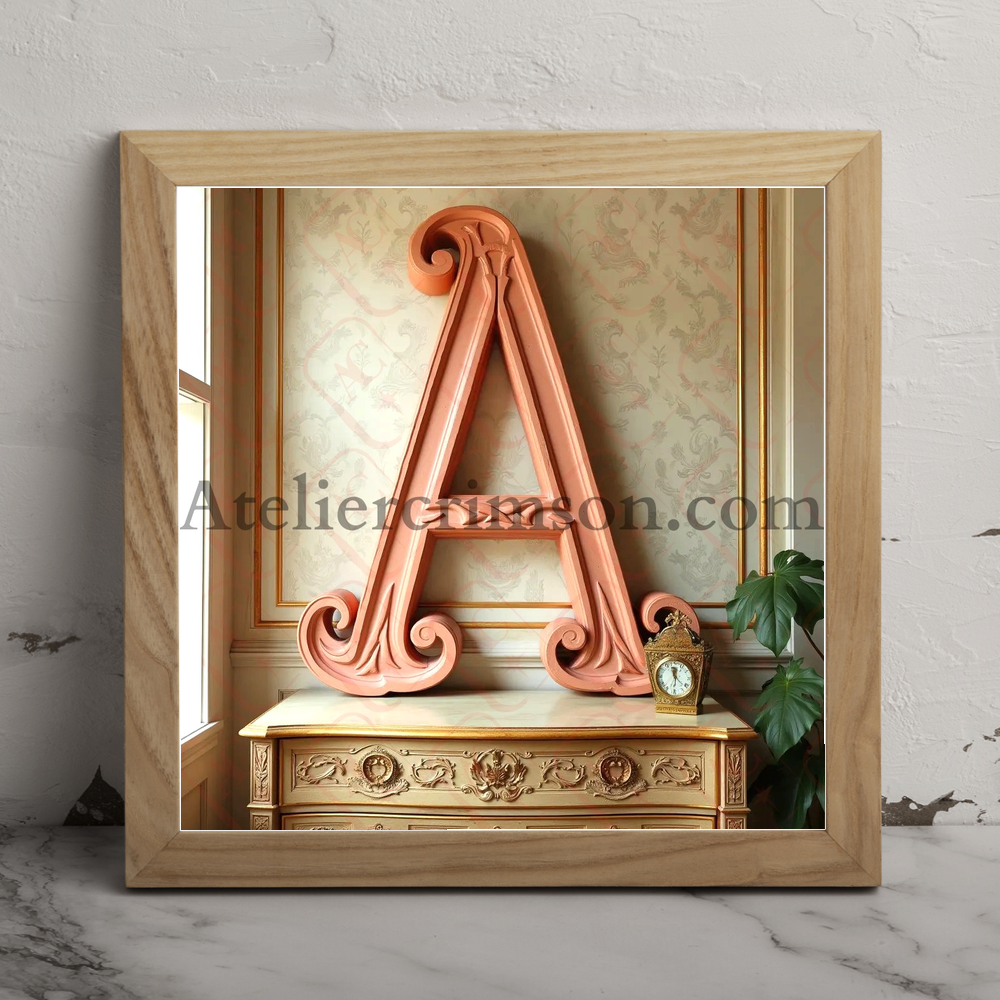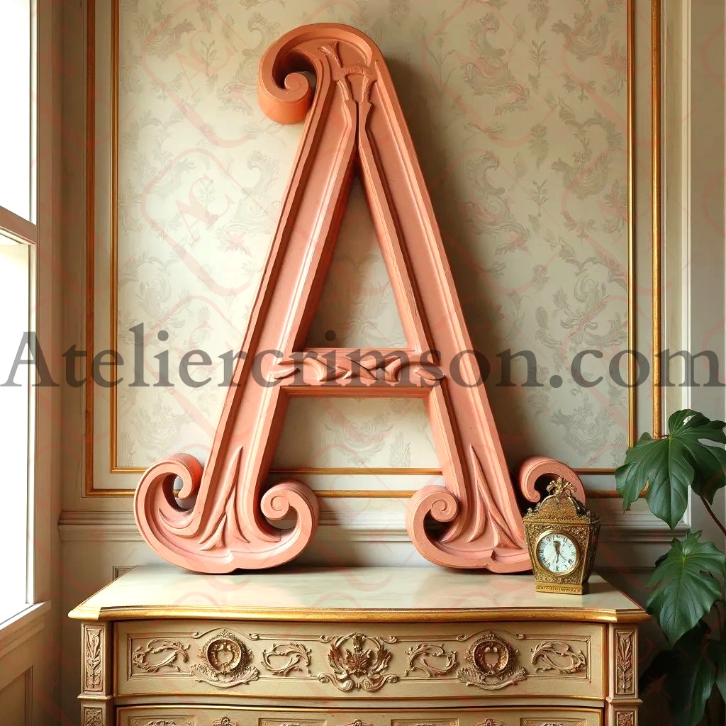 The letter A terracotta Art Nouveau typeface inspired by Alphonse Mucha's with flowing lines and floral motifs, set against a soft, muted background with a gilded wooden dresser and subtle lighting effects.