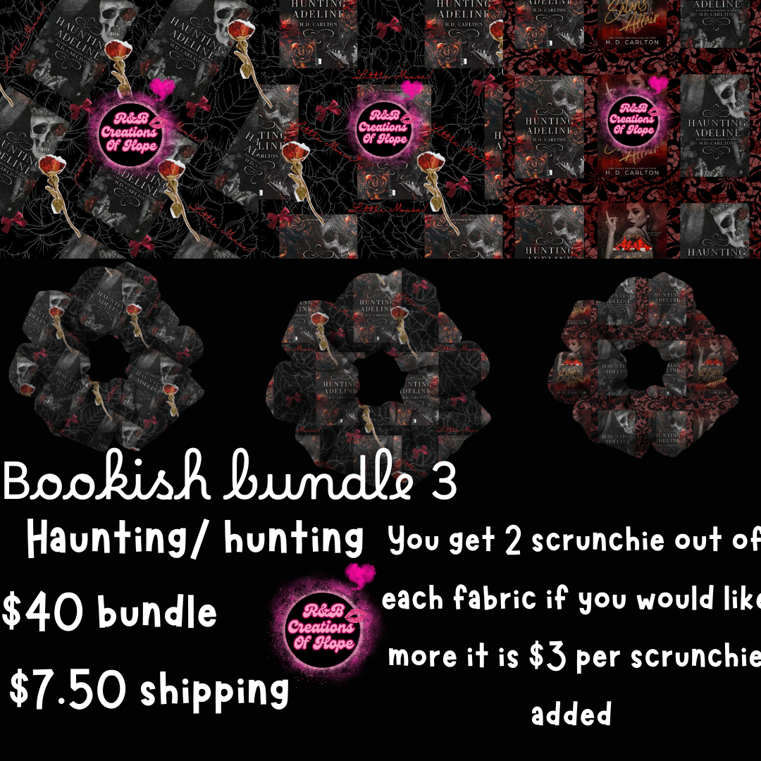 This bundle is based on haunting and hunting Adeline you get 2 scrunchies out of each fabric if you would like to add more scrunchies it is $3 extra per scrunchie make sure if you order the bundle and want to add extra you add the extra to your cart the extra listings are in options under this listing