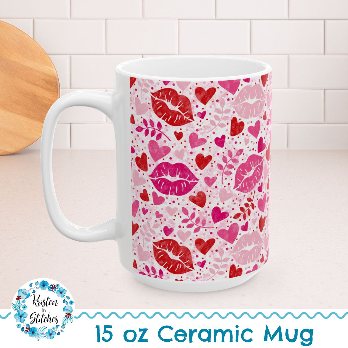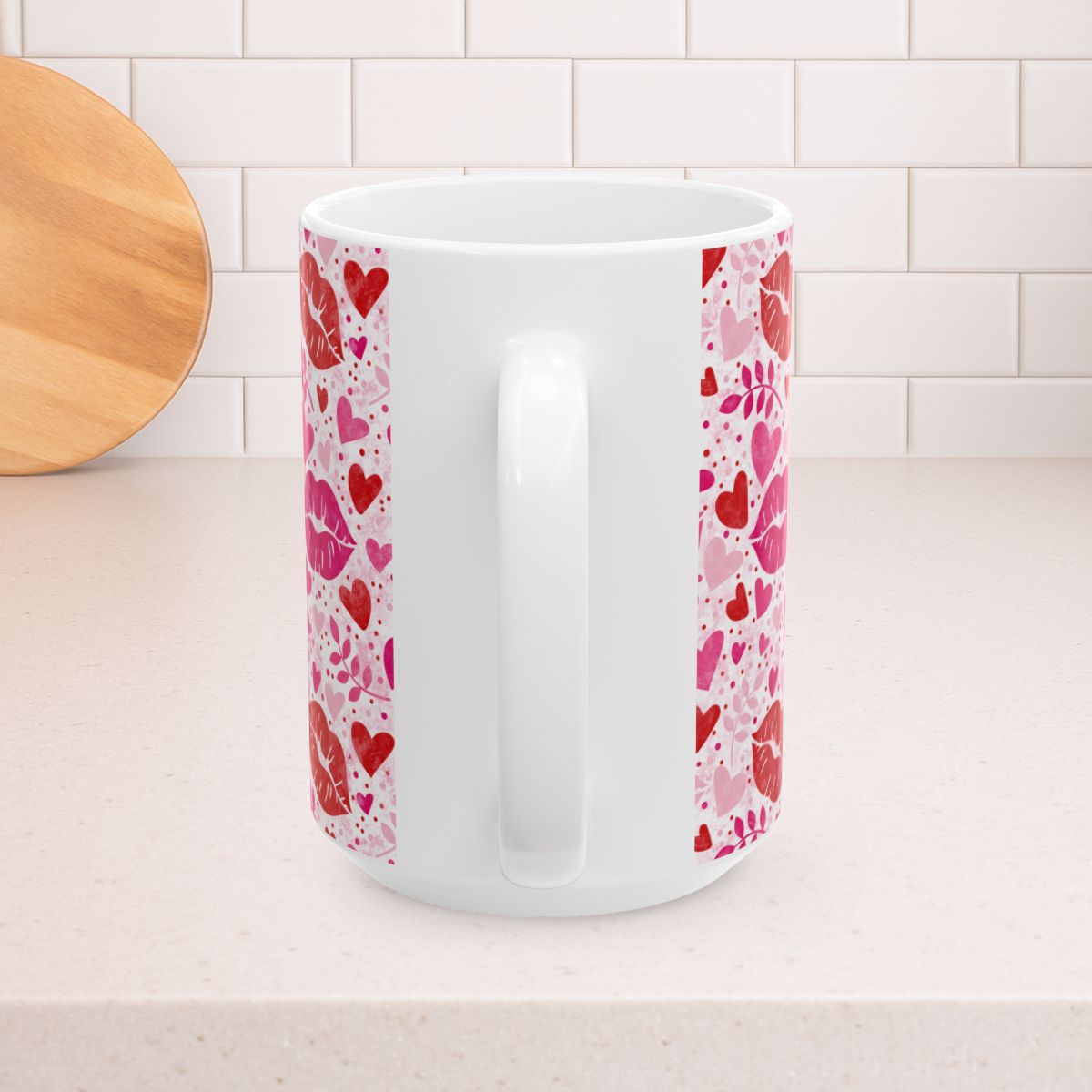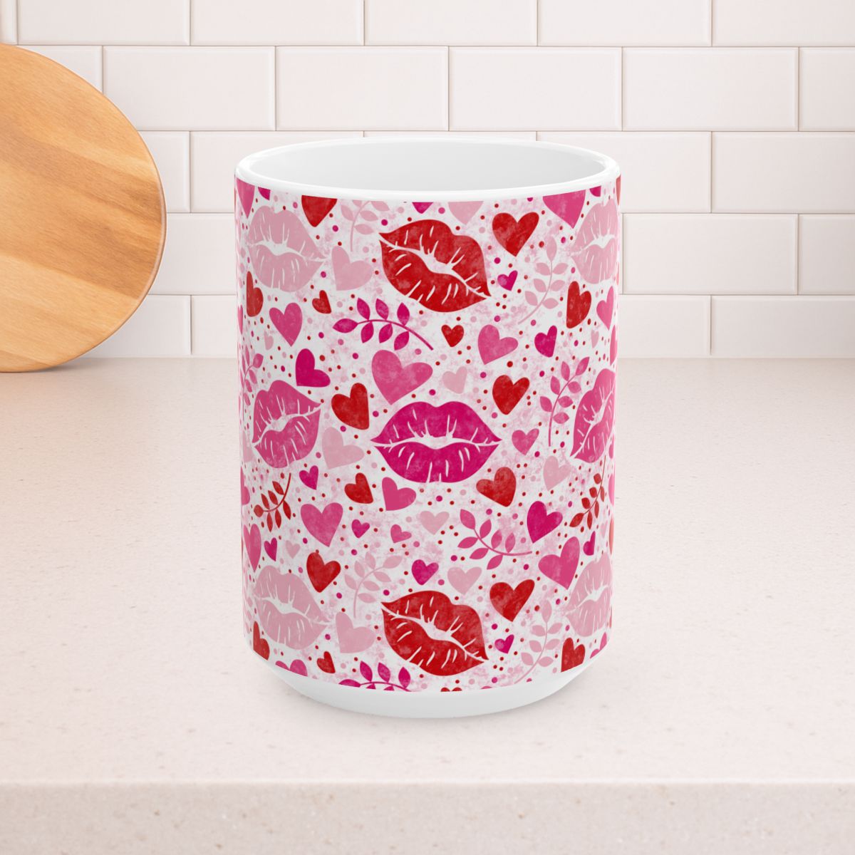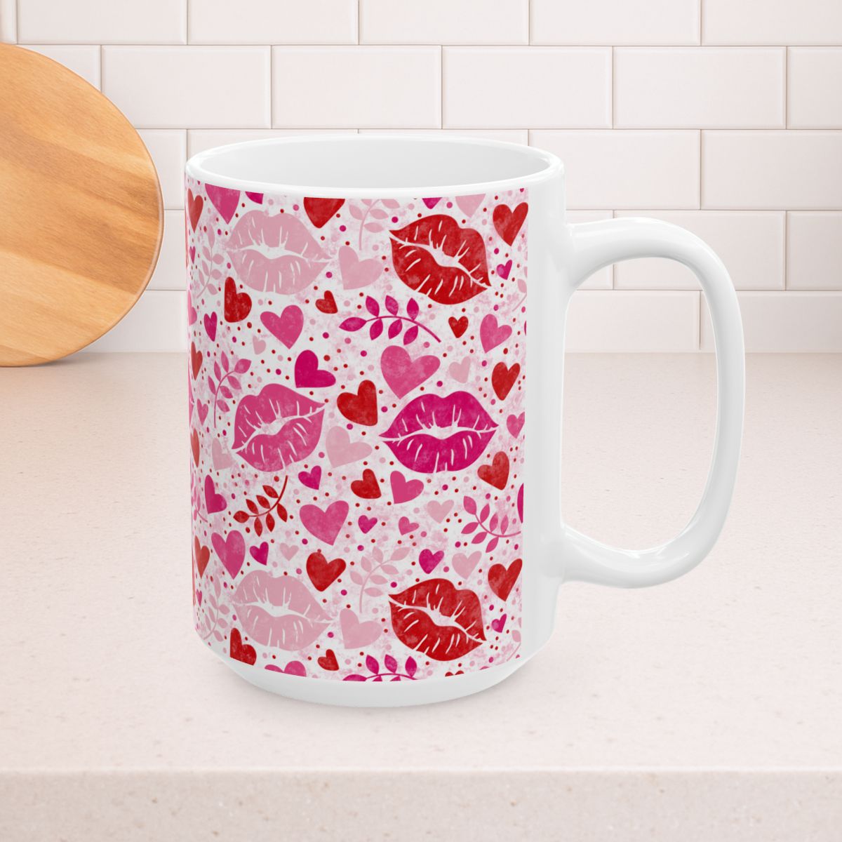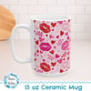 Valentine's Day Hearts and Kisses Floral 15oz Ceramic Mug, Large Coffee Cup, Pink and Red