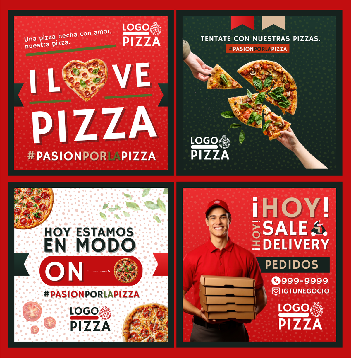 Plantilla Pizza Uno , diseño ideal para venta de Pizzeria / Restaurante. Edita textos, colores, imágenes y elementos fácilmente adaptando estos diseños a la temática de tu emprendimiento / negocio usando nuestras plantillas para Canva.