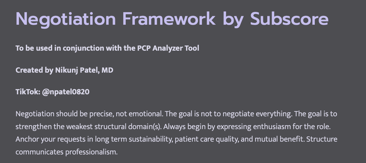 Framework to help you negotiate better depending on your subscores. To be used in conjunction with the PCP Offer Analyzer Tool.