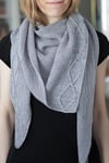 Soundscape is a beautiful triangle shawl, combining classic garter stitch with an eye-catching cabled border. The shawl is worked sideways from the cast-on tip to the bind-off edge. While the garter stitch section is a very relaxing knit, the cabled edging adds interest. The pattern includes both charted and written instructions.