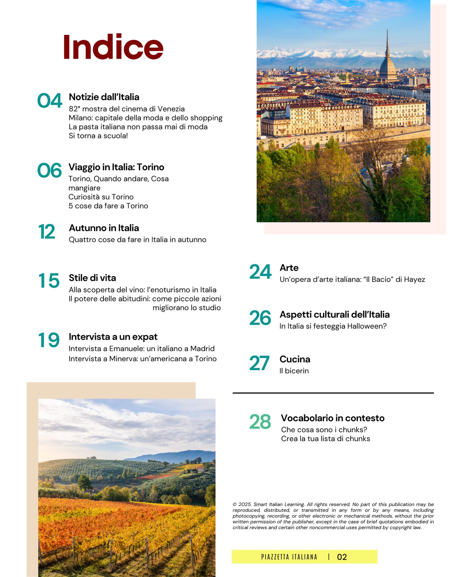 It’s a digital magazine designed for intermediate learners (A2+, B1, B2 CEFR) who are ready to move beyond the basics, but aren’t quite fluent yet. Each issue helps you bridge the gap between textbook Italian and the authentic Italian you’ll actually hear and use in everyday life.