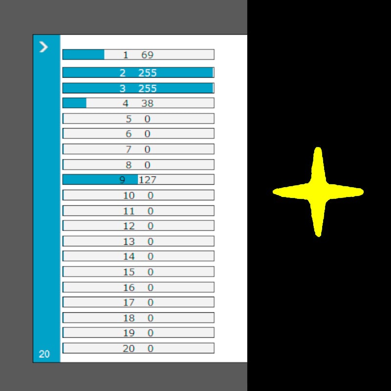 * Verifique, con el Fixture de pruebas de 20CH (click), que coincidan estos canales: 3 Dimmer, 2 Strobo / Shutter, 1 en el valor 69 = Color Amarillo, 4 en el valor 38 = Gobo de cruz, 9 Foco (tercer foto).