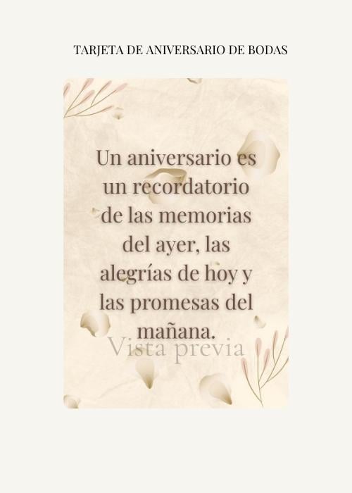 Una tarjeta con estilo vintage y textura cálida, decorada con un fondo beige sutilmente floral que transmite serenidad y elegancia. El mensaje central, “Un aniversario es un recordatorio de las memorias del ayer, las alegrĂas de hoy y las promesas del mañana”, invita a reflexionar sobre el viaje compartido, celebrando cada etapa del amor con profundidad y ternura.