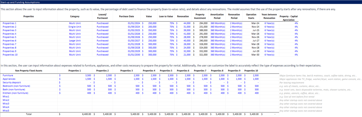 The operating expenses section allows users to set monthly expenses dependent on stays. Users can adjust the label for expense types, making the model more customizable. If the property was acquired, there is no need to input any value for the monthly lease, and the cells will be formatted differently.