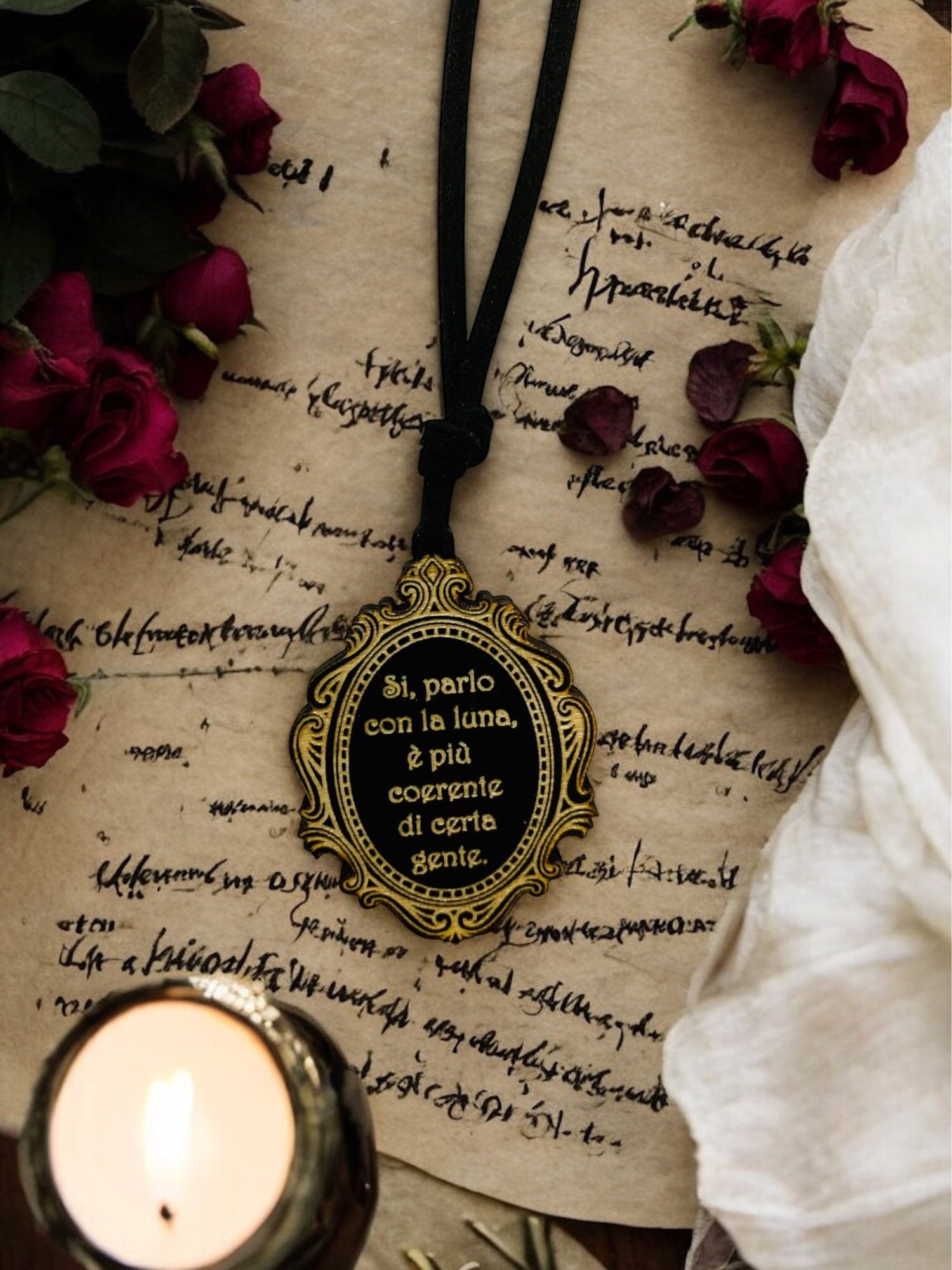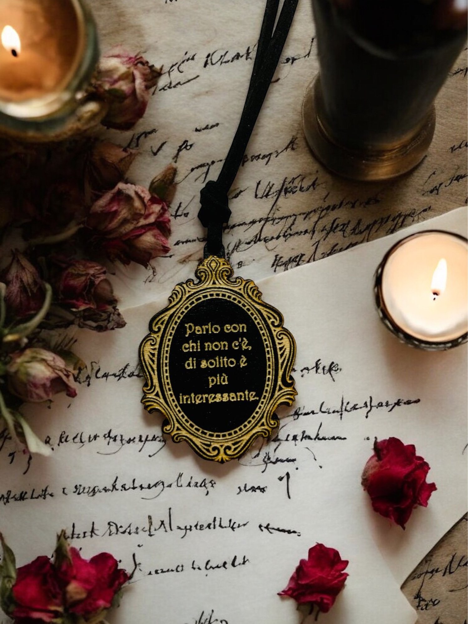Realizzata artigianalmente, incisa su legno e racchiusa in una cornice vintage, porta con sé parole che proteggono, pungono, risvegliano.