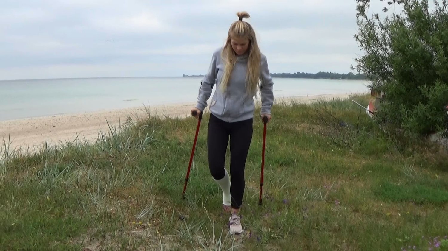 Ice crutch with a white short leg cast, dressed in tights and gray hoddie and a sneaker on her left foot.She jumps around next to a marina and looks out over the beach and the sea next to the harbor.Ice stops and looks a bit dreamy before she jumps on towards the harbor car park where the car is parked.
