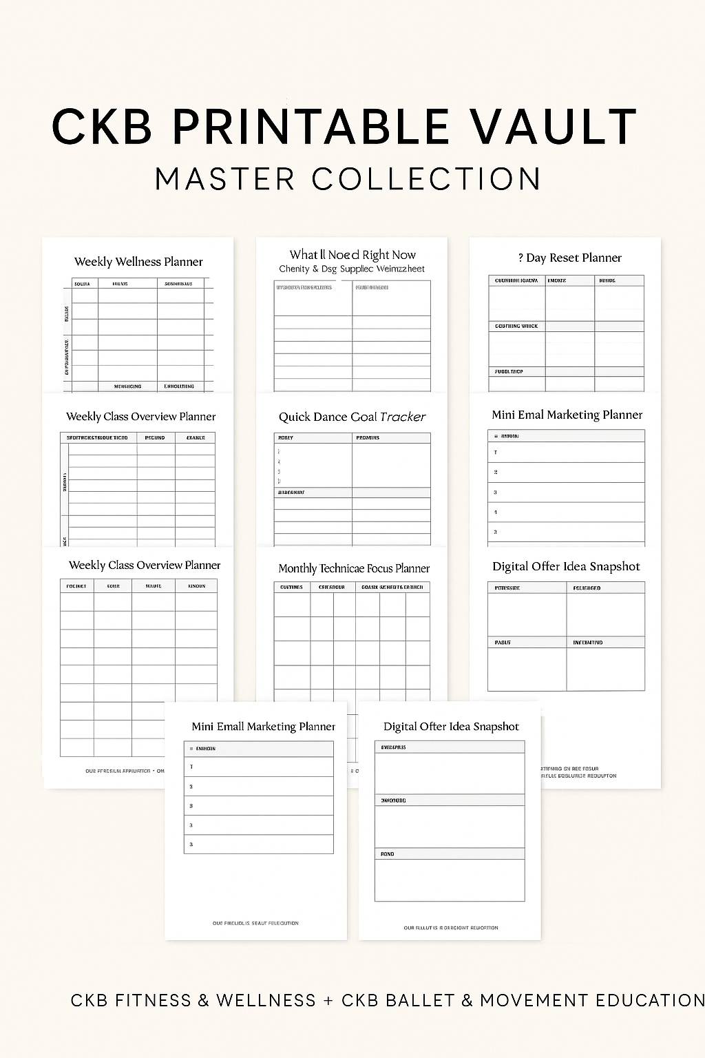 The CKB Printable Vault is your full collection of wellness trackers, dance planning tools, and digital creator worksheets — beautifully designed, fillable, and ready to support your goals.