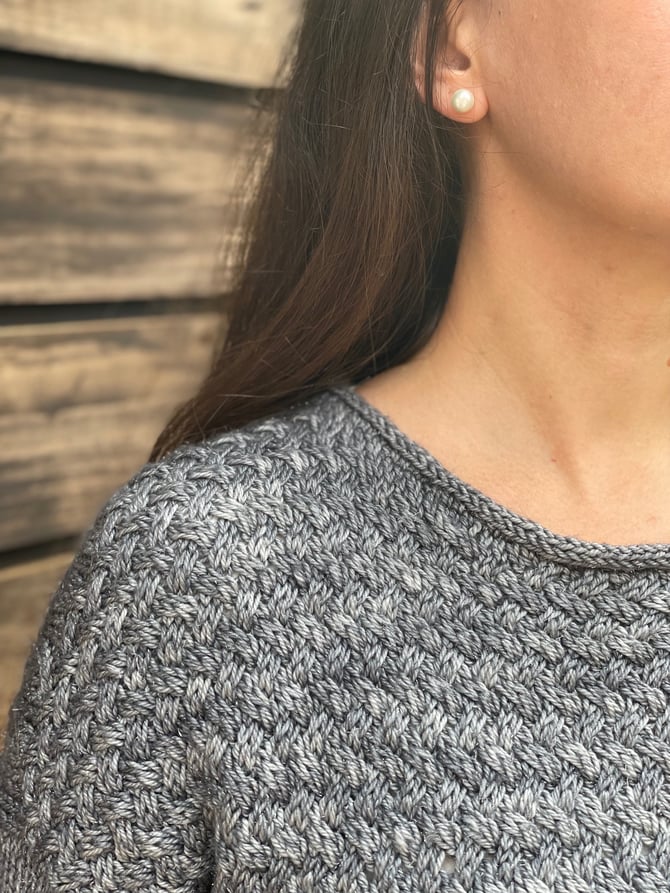 El suéter Carnaúba es un patrón divertido e interesante, tejido en circular en un motivo trenzado tipo canasta desde abajo hacia arriba.