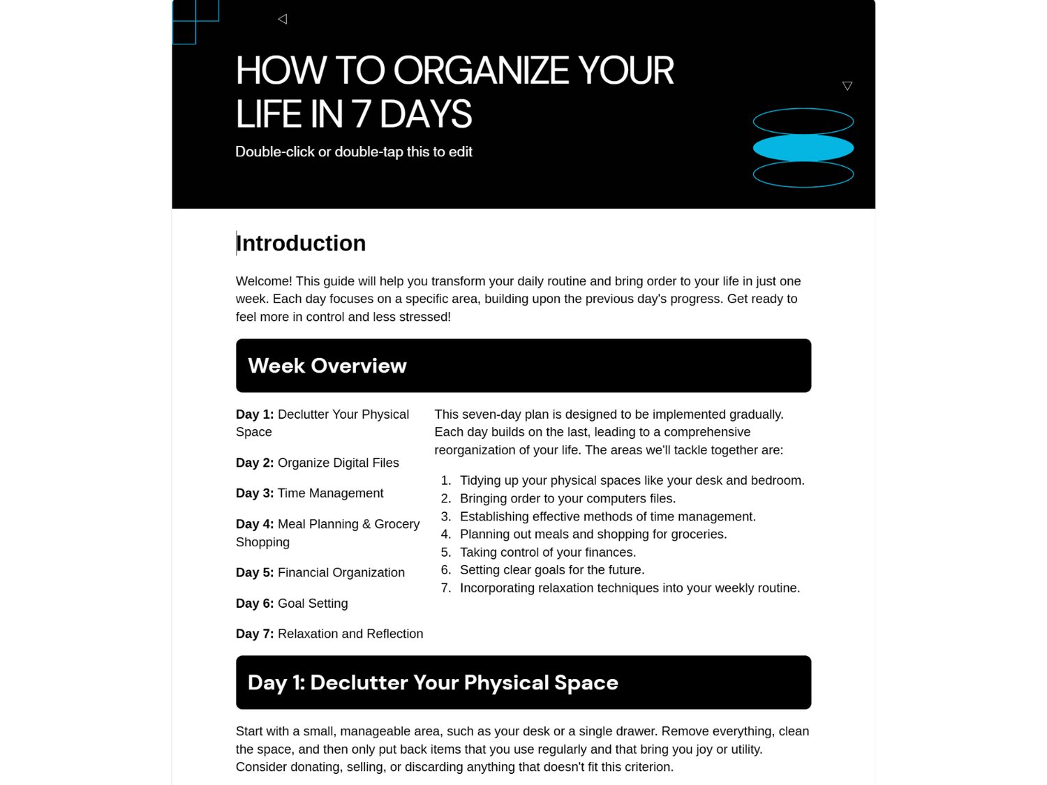 This 10–15 page workbook helps you declutter your space, organize your time, clean up your digital life, and rebuild better routines — one day at a time.