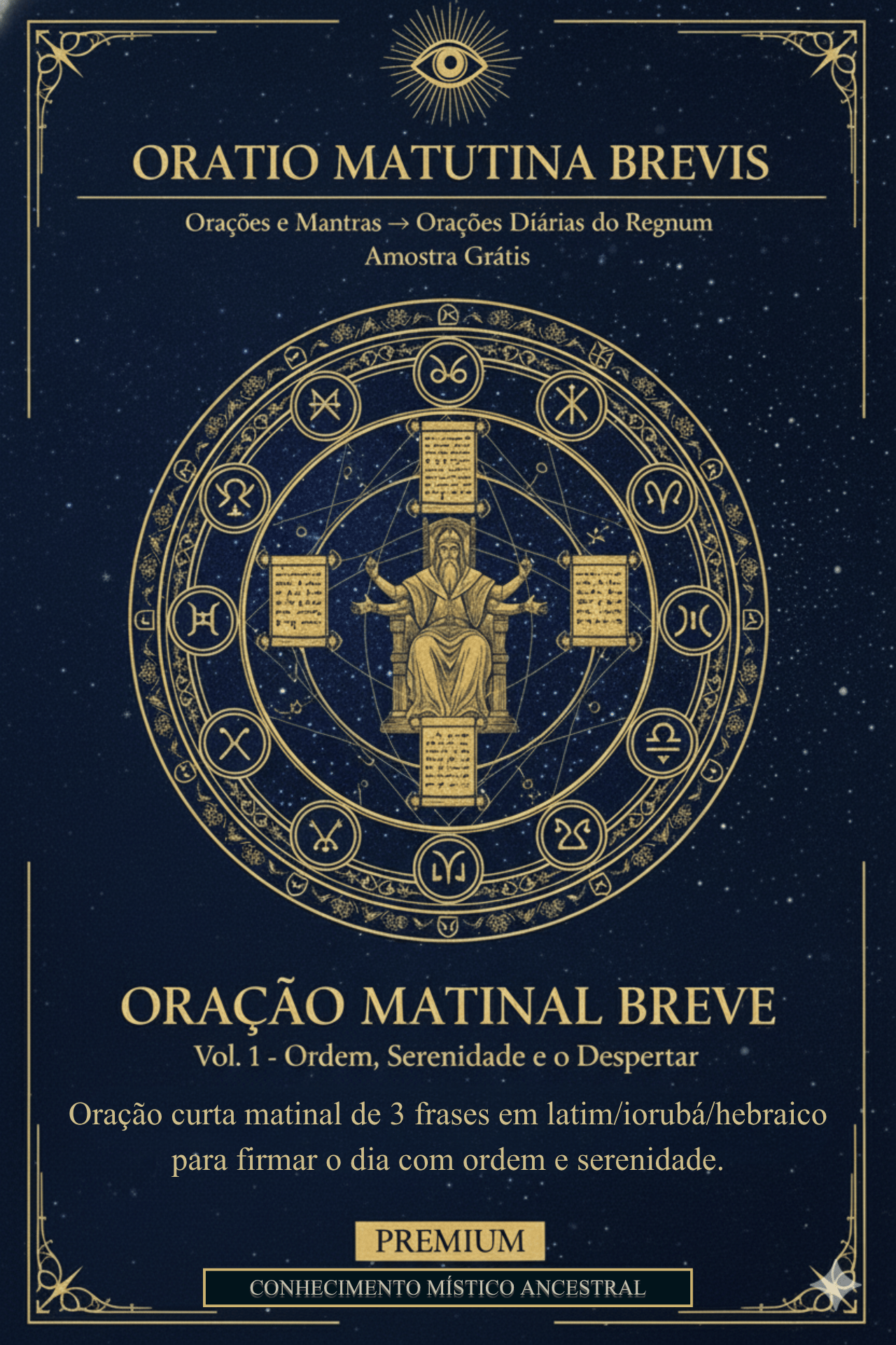 Esta oração brevíssima é o seu restaurador de eixo. Com apenas três frases (em Latim, Iorubá e Hebraico), você reafirma que toda força vem de El Elyon. A prática matinal evita a dispersão, garantindo que a Ordem governe o seu dia desde o primeiro sopro.