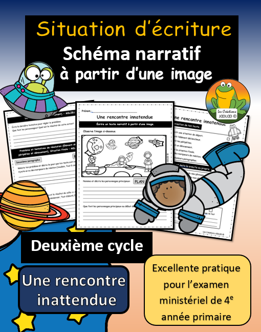 Voici une situation d'écriture clé en main pour les élèves du 2e cycle afin de travailler le texte narratif à la manière de l'examen d'écriture ministériel à la fin du cycle. L'élève doit écrire une histoire narrative à partir d'une image donnée. Pour ce faire, un plan détaillé lui permet d'aller à son rythme afin de bien comprendre chacune des parties. Un rappel dans les consignes du plan lui permet aussi d'incorporer des marqueurs de relation dans son texte afin de le rendre plus fluide.