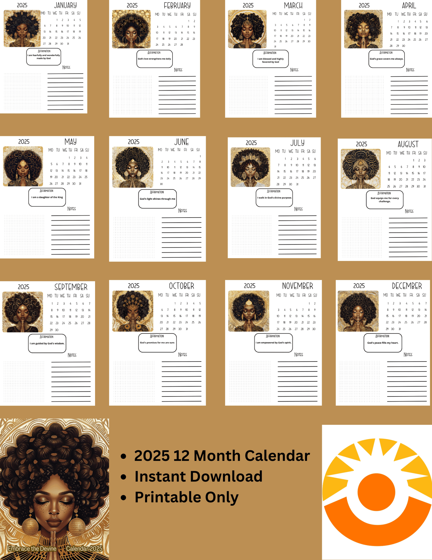Welcome 2025 with this beautiful 2025 Embrace the Divine Calendar! Designed to uplift, inspire, and encourage self-care, this printable 12-month calendar combines powerful affirmations with stunning artwork to guide you through each month. Ideal for anyone focusing on self-empowerment, mindfulness, and personal growth, this calendar is perfect for your workspace, bedroom, or any place that needs a touch of motivation.