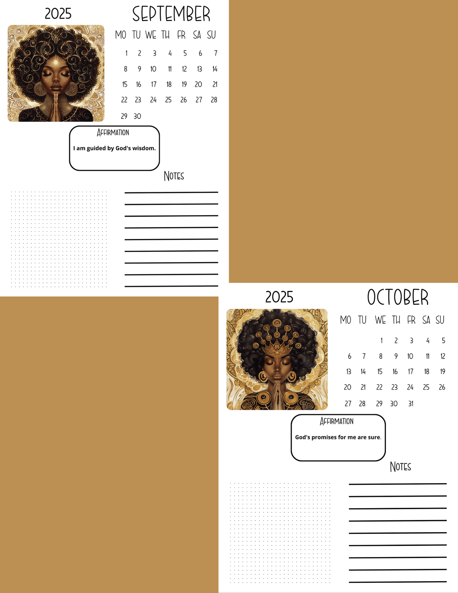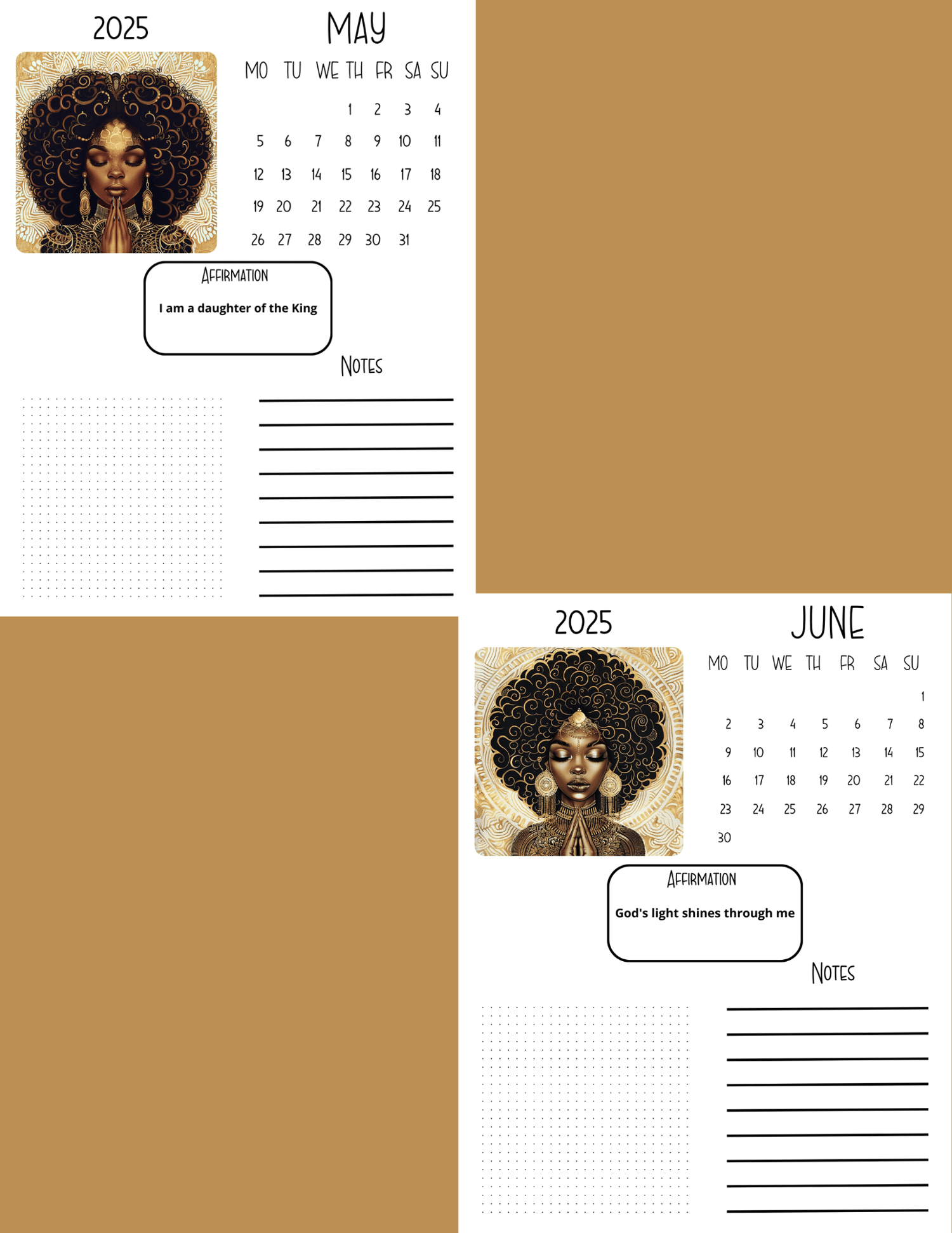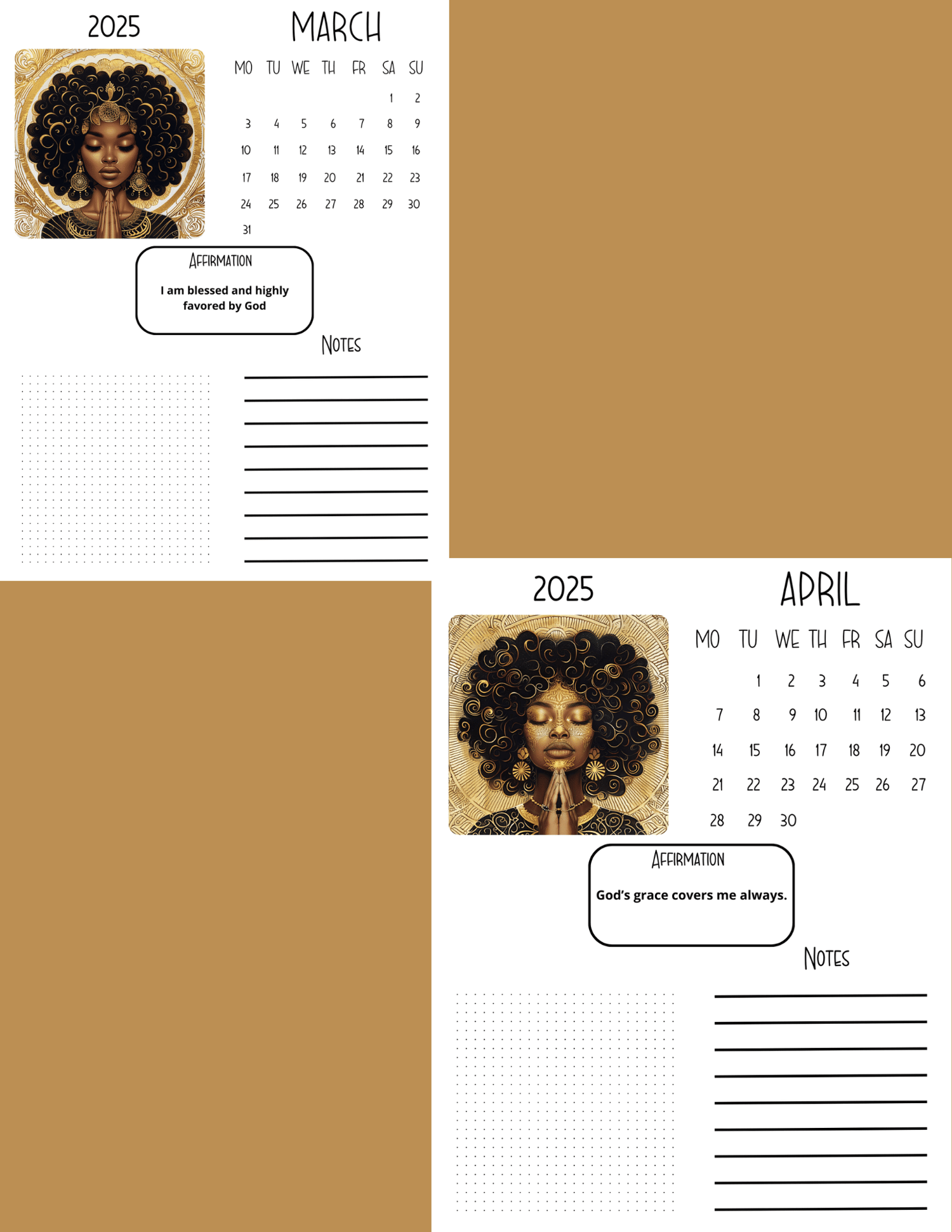 - 1 High-Resolution PDF – Includes 12 monthly pages, each with unique artwork and affirmations.